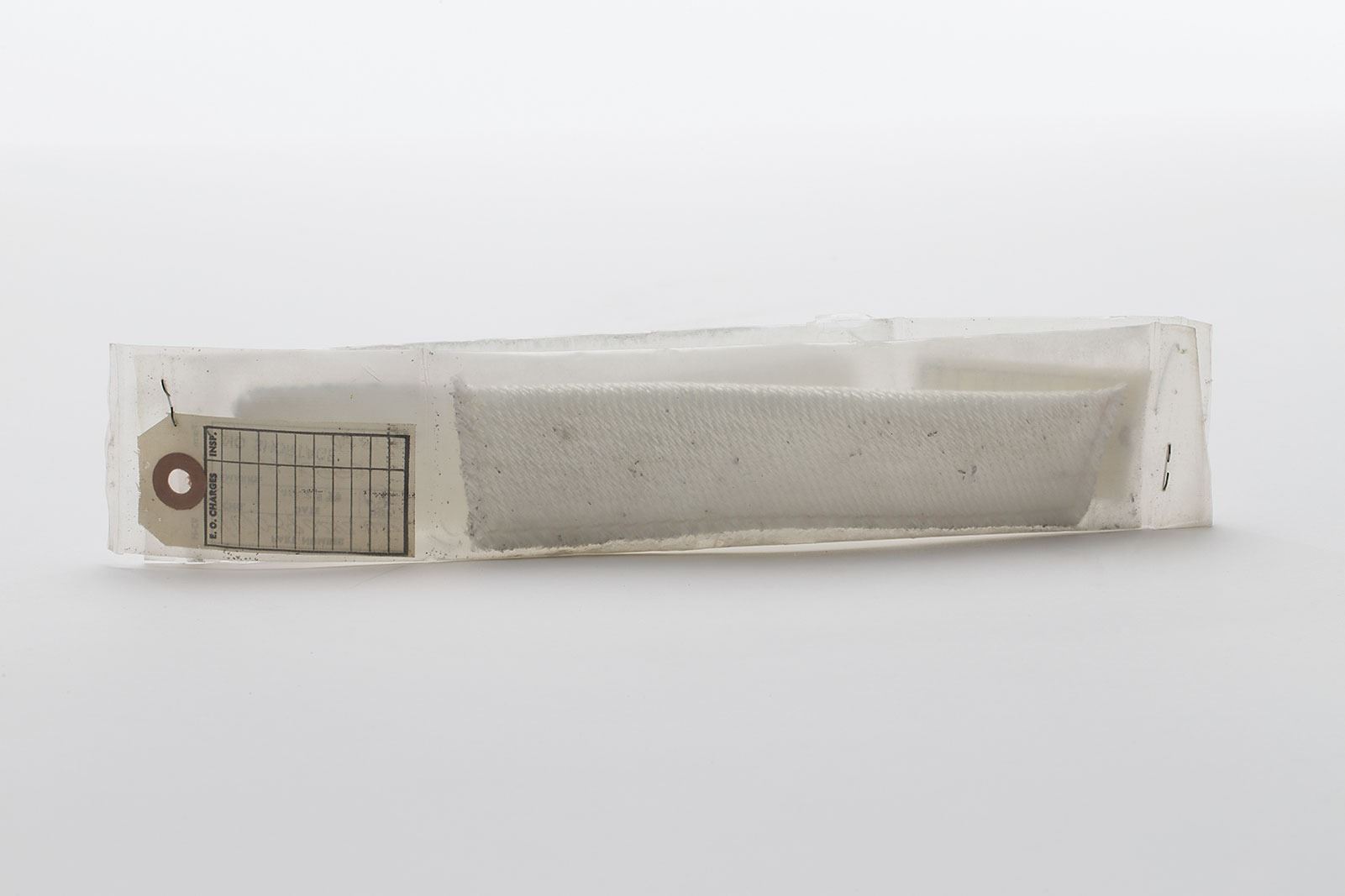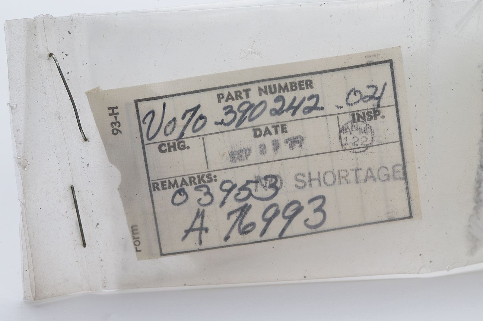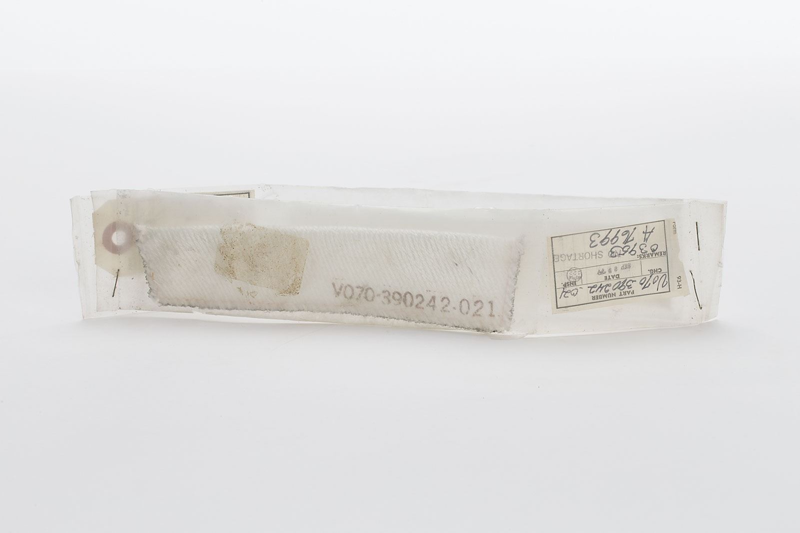 Two pieces of Space Shuttle thermal insulation, each measuring 6.5? x 1.5?, both sealed in plastic and marked "V070-390242-021." Sealed with each strip are inspection tags marked "No Shortage," dated September 25, 1979. In fine condition.
