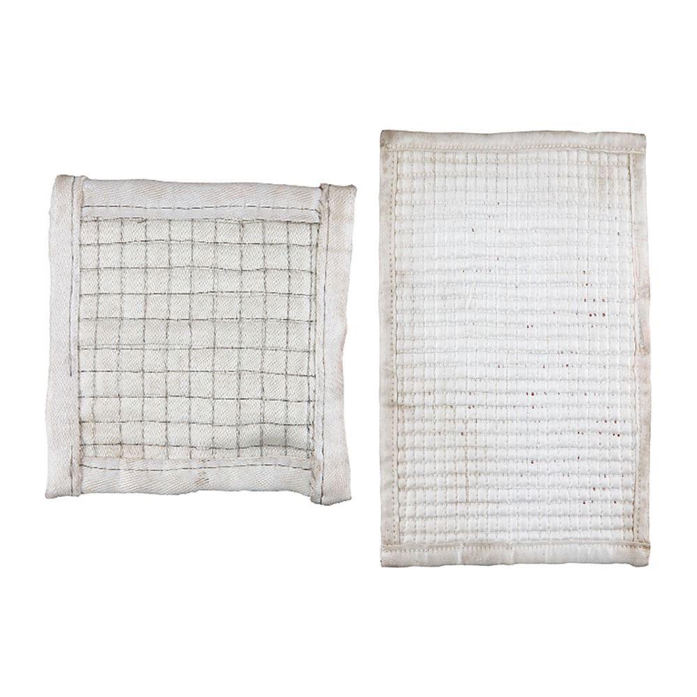 Group of two white Thermal Multi-Layer Insulation (MLI) Insulation Blankets associated with the Space Shuttle Orbiter Thermal Protection System, including: one larger 15.75? x 12.75? piece with dark red/brown adhesive on the reverse for application on the flight vehicle structure; and one smaller 6.25? x 6.25? piece. Both with finished edges. In overall fine condition.