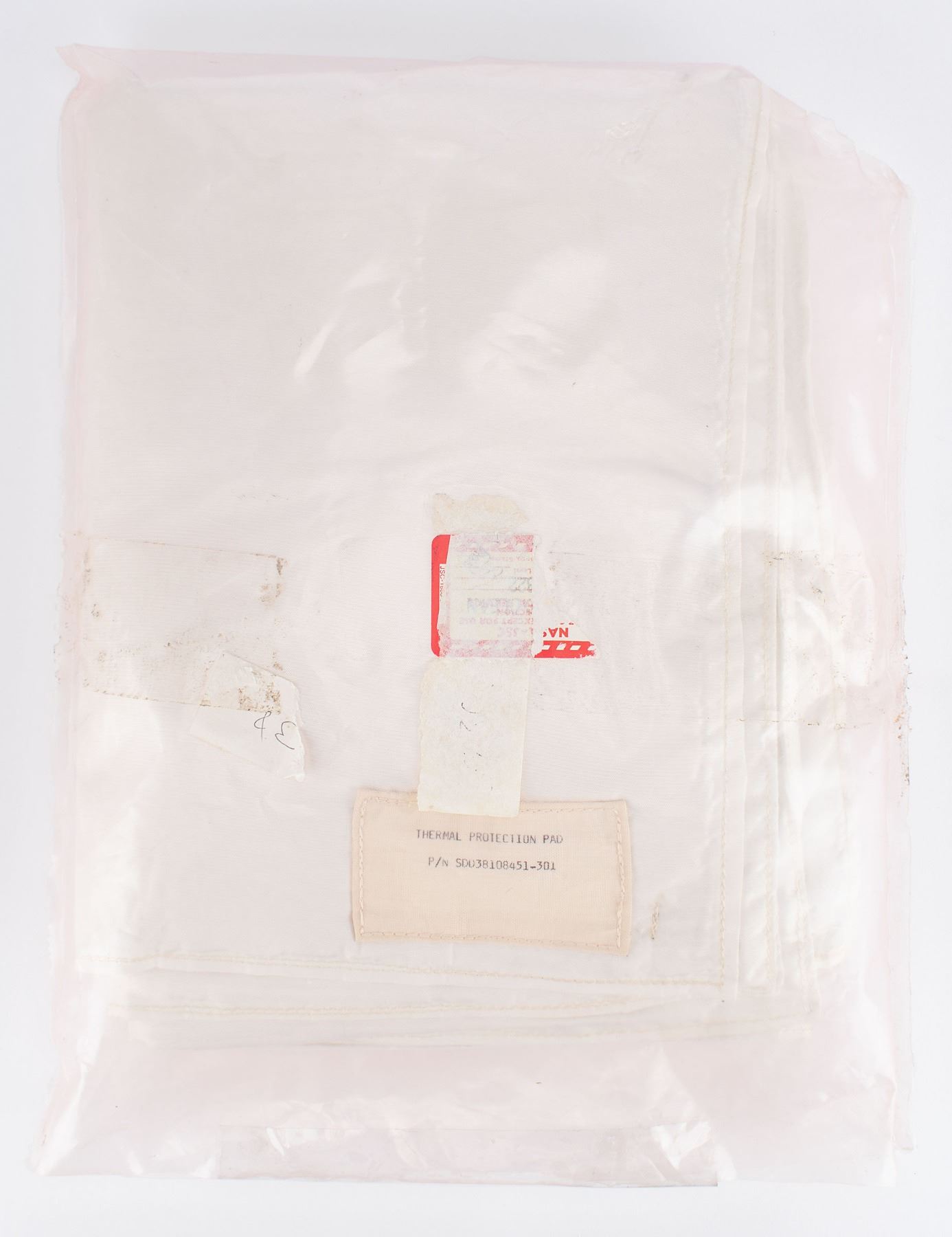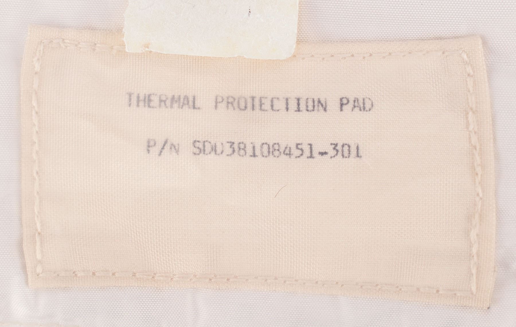 Beta cloth thermal protection blanket from the Space Shuttle program, measures 10˝ x 13˝ x 1.25˝ folded (approximately 2´ x 3´ unfolded), with label marked: “Thermal Protection Pad, P/N SDD38108451-301.” Includes its original deaccession bag with torn red “NASA-JSC” label. In fine condition. The consignor notes that this Class I flight item was purchased as NASA surplus.