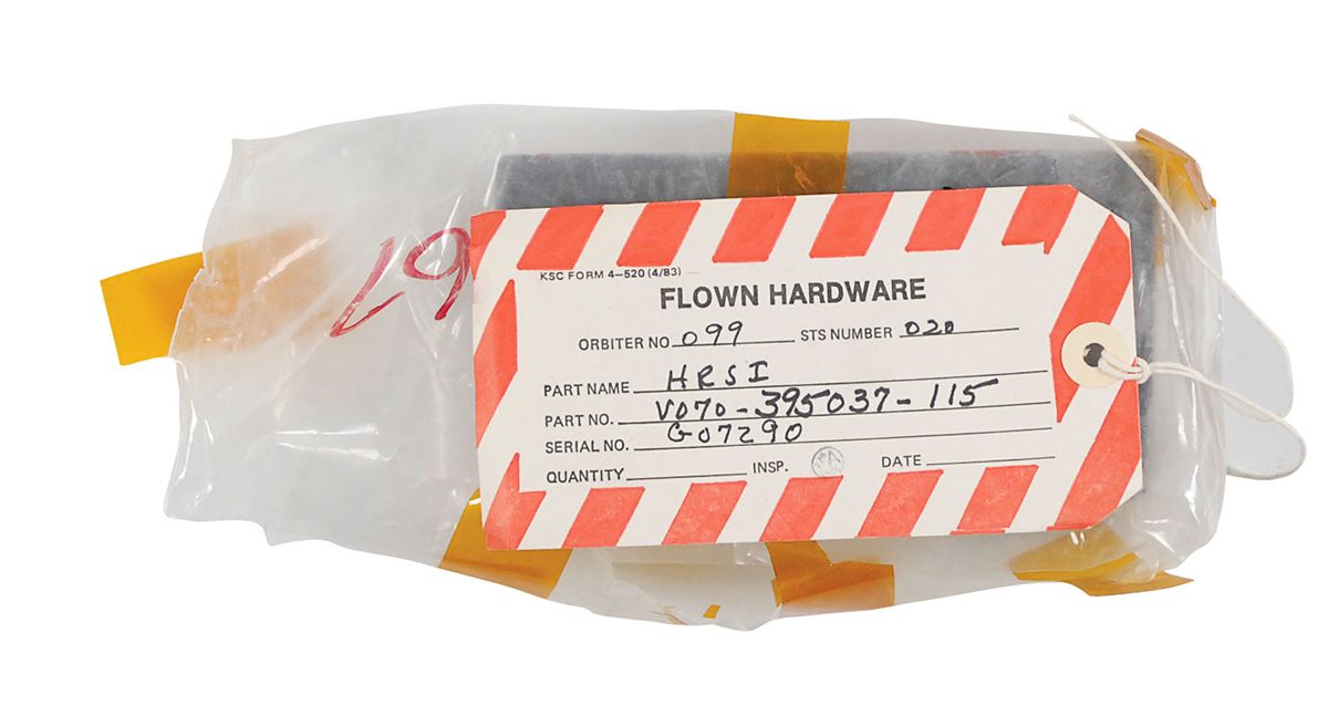 Available to US bidders only. Flown black thermal protection system tile, 6 x 3, with NASA identification numbers stencilled on one side, “V070-395037-115.” Accompanied by its Flown Hardware tag, filled in by a technician, “Orbiter No. 099, STS Number 020,” (referring to its 20th processing flow). This is a high-temperature reusable surface insulation (HRSI) tile and and has been decommissioned with red paint. Scattered wear and chips, otherwise fine condition.