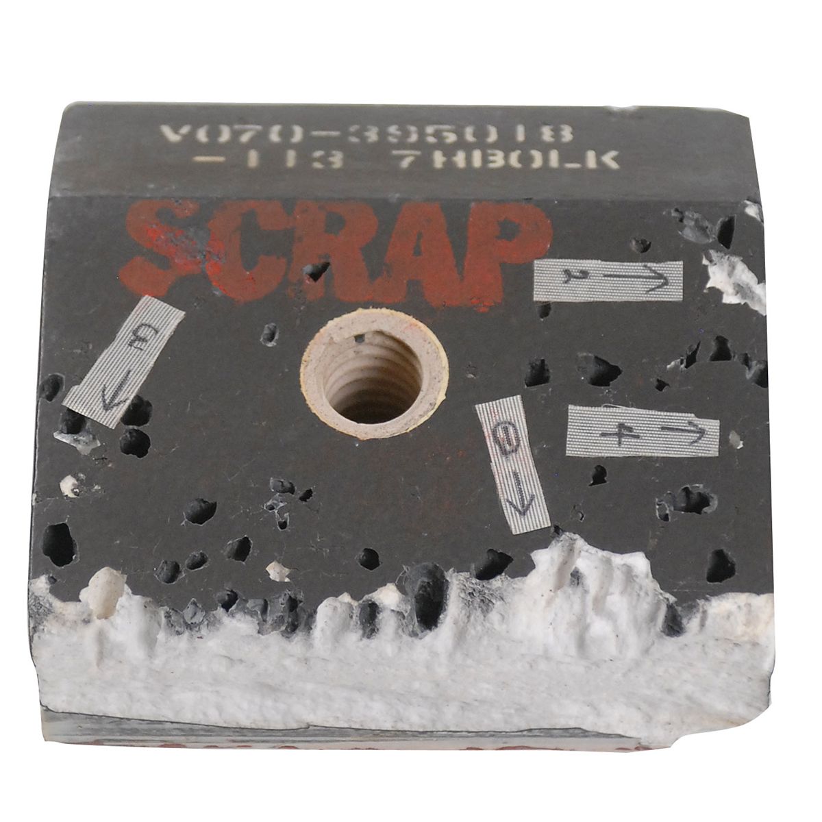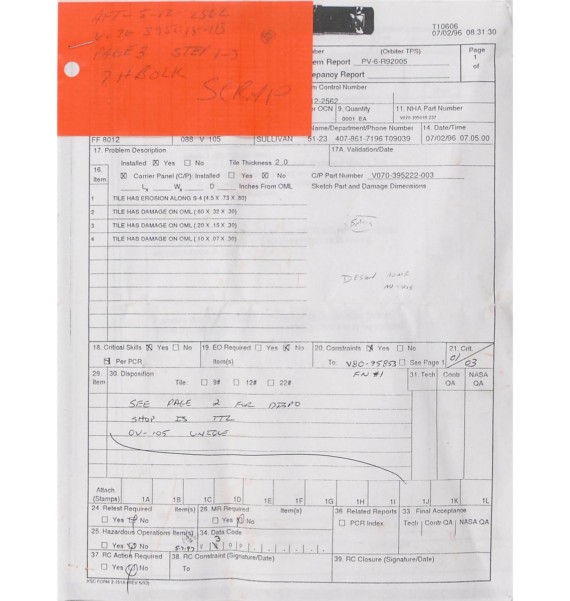 Available to US bidders only. Angled black shuttle tile, measuring 5 x 5 x 2, numbered V070-395018-113 7HBOLK, removed from the space shuttle Endeavour. Tile has a hole near the center for a bolt, with scattered areas of pitting to one side, four small pieces of tape affixed to the side pointing out the damage, as well as red paint and coverings to denote the tile being decommissioned. Accompanied by the NASA problem report, dated July 2, 1996, detailing the problem and the procedures for its removal, as well as its orange scrap tag. As Endeavour returned from STS-77 on May 29, 1996, the removal of this tile just a few weeks later suggests that it was flown on the spacecraft and damaged during the course of the mission. In fine condition, with aforementioned damage.