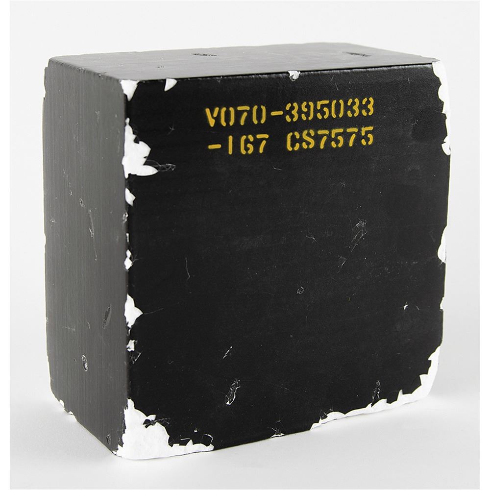 Available to US bidders only. Thick black-and-white tile designed for use on the Space Shuttle Orbiter Thermal Protection System, measuring 6è x 6è x 3.5è, marked in yellow stencil, ‰ÛÏV070-395033-167 CS7575.‰Û Each Space Shuttle carried over 24,000 separate TPS tiles, each a different size and shape. In very good to fine condition.