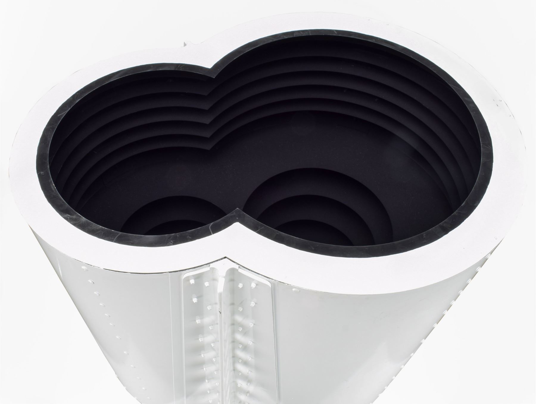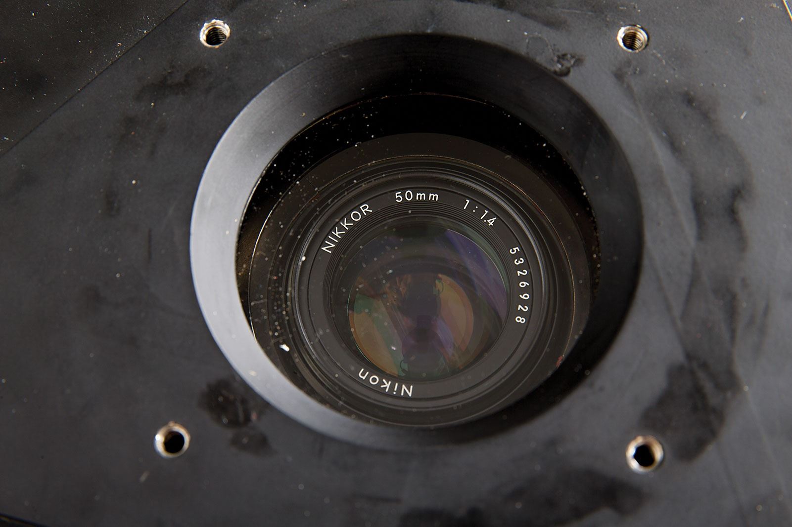 Impressive dual-lens Space Shuttle Wide Field Camera (WFC) with lens hood, the main white canister camera body measuring 16˝ in diameter and 25˝ tall, set upon a 21˝ x 25˝ three-legged base, and the lightweight lens hood measuring 17˝ x 22.5˝ x 21˝. The white canister’s body bears a Teledyne tag, reading: “WFC Canister Assembly, Part No. F5-10042-1, Contr. No. NAS8-32712, For NASA-MSFC.” The canister top and cover are removable, revealing two Nikon Nikkor lenses (50mm f/1:1.4 and 85mm f/1:1.4), as well as blue Automax film magazines and internal electronics. The lens hood has a red metal cover stenciled “Non-Flight Item,” and the interior is ribbed with flat black panels to absorb sunlight and reduce lens flare. In fine condition.