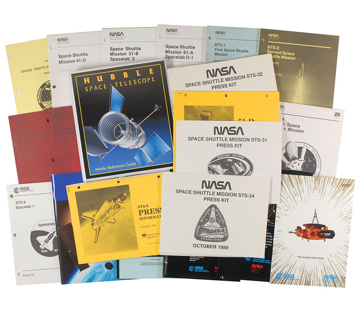 Large collection of press kits and media publications. Included are press kits for shuttle missions STS-1, 2, 3 (3), 5, 6, 7, 8, 9 (2), 31, 32, 41-D, and 61-A. The Hubble publications include a press kit, media reference guide, and the Optical Telescope Assembly and Fine Guidance System guide. Also included are a press kit and data book for the Ulysses program.