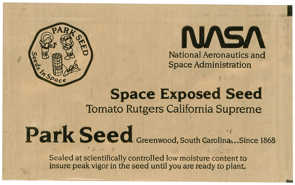 Presented is a 4 x 2.5 unopened foil packet of “space exposed” tomato seeds. The packet is protectively sealed in clear plastic. Millions of tomato seeds were sent into space aboard the 1984 space shuttle Challenger STS-41C mission, as part of NASA's Long Duration Exposure Facility to observe the effects of deep space on the seeds. The cargo remained in Earth orbit for 5 years until 1989, when Columbia Shuttle Mission STS-32 retrieved the packets and the seeds were returned to Earth. They were then distributed to over 3 million students for use in science experiments—one of the largest science experiments ever.
