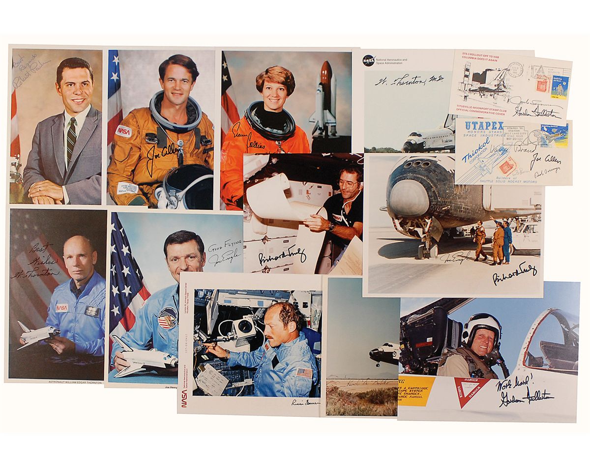 Collection of 12 items consisting of signed photos and covers, each signed by a shuttle pilot. Photos are signed by Joe Allen, William Thornton (2), Gordon Fullerton, Rick Hauck, Karol Bobko, Joe Engle, Robert Parker, Eileen Collins, and Richard Truly; a commemorative cover with a cachet honoring Utah’s space industries, signed in black ink by STS-5 crew members Joe Allen, Vance Brand, Bob Overmyer, and W. B. Lenoir; and a commemorative cover with a cachet honoring the rollout of the Space Shuttle Columbia, signed in black felt tip by Jack Lousma and Gordon Fullerton. In fine condition.