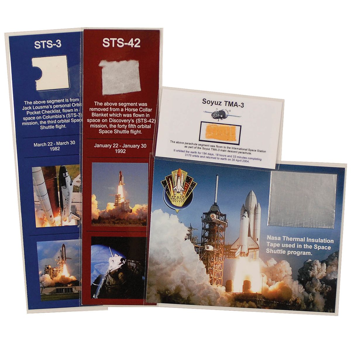 Collection of three relics from the Shuttle program: a clipped segment of Jack Lousma’s personal orbit checklist flown on Columbia’s STS-3 mission; a flown segment of a horse collar blanket flown on Discovery’s STS-42 mission; and a square section of thermal insulation tape. Also included is a small swatch of parachute material from Soyuz TMA-3’s descent parachute. Each relic is affixed to a various sized informational card.