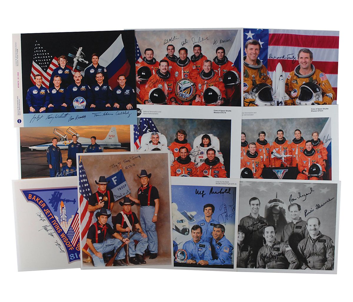 Ten color crew photos, mostly NASA, all 8 x 10 or 10 x 8, each signed in felt tip by members of the crew pictured. Missions are: STS-79 (signed by five), STS-106 (signed by six), STS-2 (signed by Richard Truly), STS-81 (signed by Marsha Ivins), STS-41 (signed by two), STS-76 (signed by five), STS-81 (signed by five), STS-9 (signed by three), STS-7 (signed by four), and STS-6 (signed by Paul Weitz). In fine condition.
