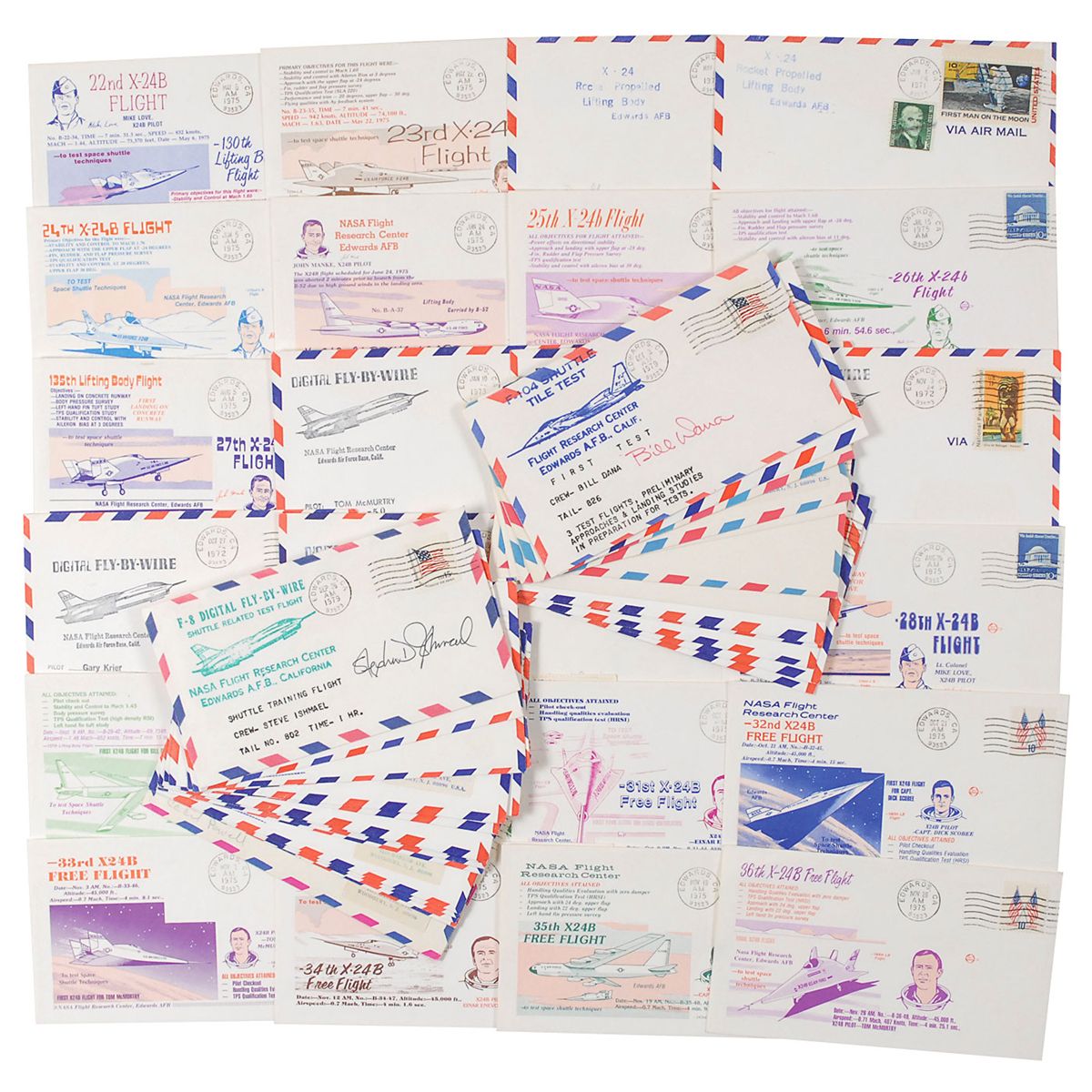 Collection of 100 Space Shuttle test flight covers, dating from 1971–1979, each with stamped or printed cachets, and all bearing Edwards Air Force Base cancellations. Eight of the covers are signed by the mission pilot(s). Signers are: Bill Dana, Gary Krier (ins), Tom McMurtry (ins), Einer Enevoldson, Steve Ishmael, John Manke, Fitz Fulton and Vic Horton, and Don Mallick and Ray Young. In fine condition.