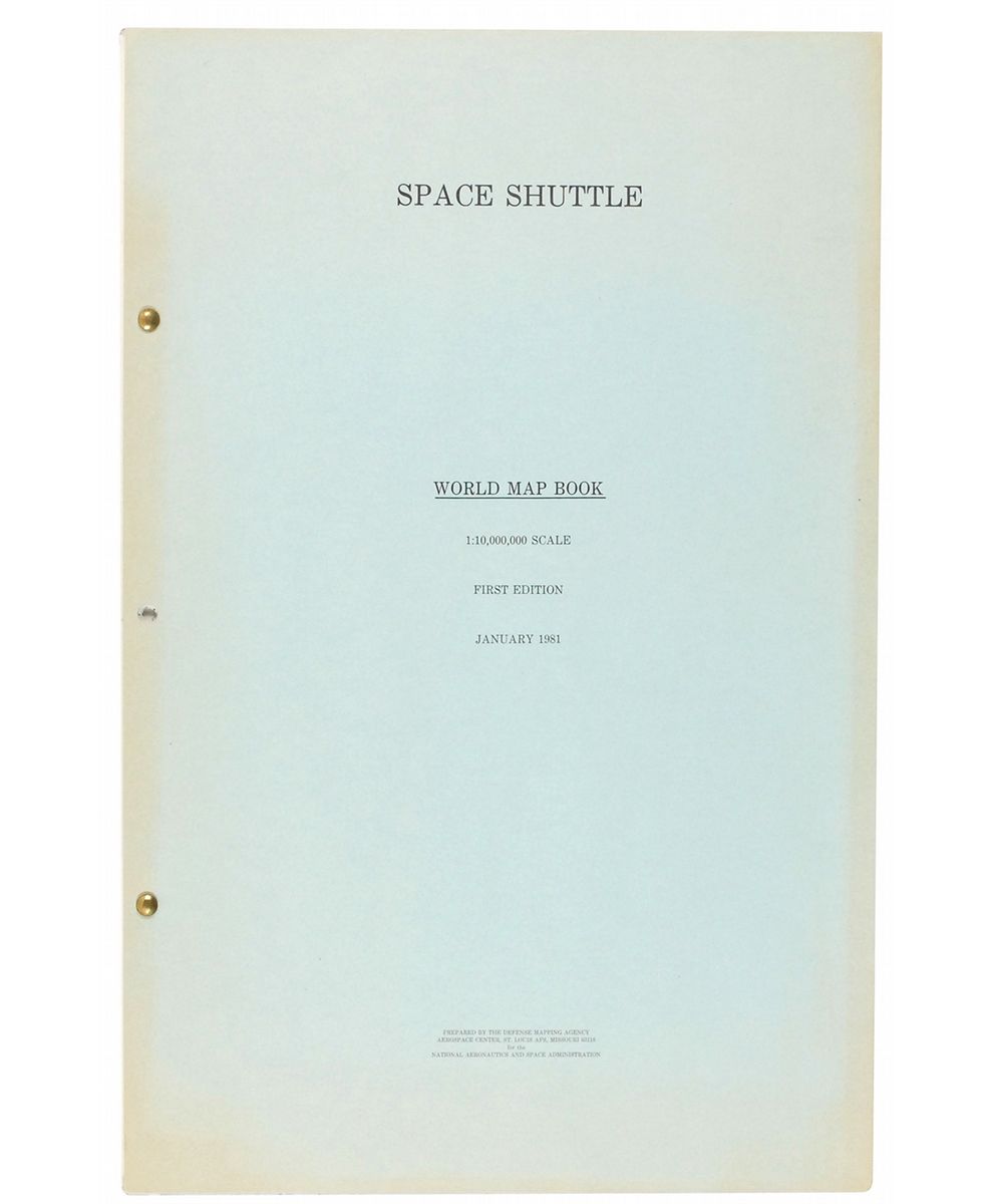 Brad-bound book titled “Space Shuttle World Map Book,” first edition, dated January 1981. Book measures 11 x 17 and contains 47 pages of 1:1,000,000 scale maps of the earth for use from space. In fine condition, with some mild toning to cover.