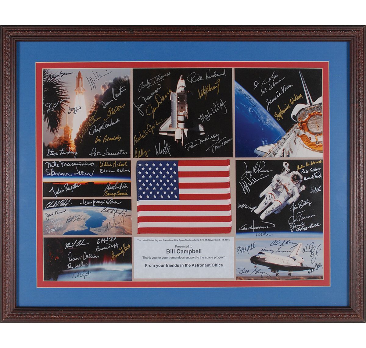 Fabric American flag, 5.5 x 4.25, flown aboard the Space Shuttle Atlantis on the STS-66 mission from November 3–14, 1994. The flag is affixed to a 16.5 x 12.5 presentation display featuring several color Space Shuttle images, signed in various inks by 64 astronauts, including: Ellen Baker, Jeffrey Williams, David C. Leestma, Patrick Forrester, Steven Lindsey, William Readdy, William McArthur Jr., Dominic Gorie, Andrew Thomas, James Newman, Jan Davis, Umberto Guidoni, Scott Kelly, Mike Lopez-Alegria, Rick Husband, Scott Horowitz, Mark Polansky, Pamela Melroy, Tom Jones, Jim Kelly, Bob Cabana, Janice Voss, Stephanie Wilson, Michael Massimino, William McCool, Shannon Lucid, Ellen Ochoa, Julie Payette, Marsha Ivins, Nancy Currie, Charles Hobaugh, Janet Kavandi, Jean-Francios Clervoy, Donald Pettit, Rick Sturkow, Heidi Stefanyshyn-Piper, Robert Curbeam, Jerry Ross, Jeffrey Williams, Jeff Wisoff, Chris Hadfield, Marc Lee, Leroy Chiao, Lisa Nowak, Piers Sellers, Gerhard Thiele, Edward Lu, James Reilly, Joseph Tanner, Joan Higginbotham, Lee Morin, Michael Anderson, Mike Fincke, Eileen Collins, Rex Walheim, Brent Jett, Brian Duffy, Susan Still, Pedro Duque, Carlos Noriega, Wendy Lawrence, Mike Bloomfield, Duane Carey, and Bill Gregory. A typed inscription below the flag notes the mission it was flown on and reads: “Presented to Bill Campbell. Thank you for your tremendous support to the space program. From your friends in the Astronaut Office.” Attractively double-matted and framed to an overall size of 21.5 x 17.5. In fine condition.