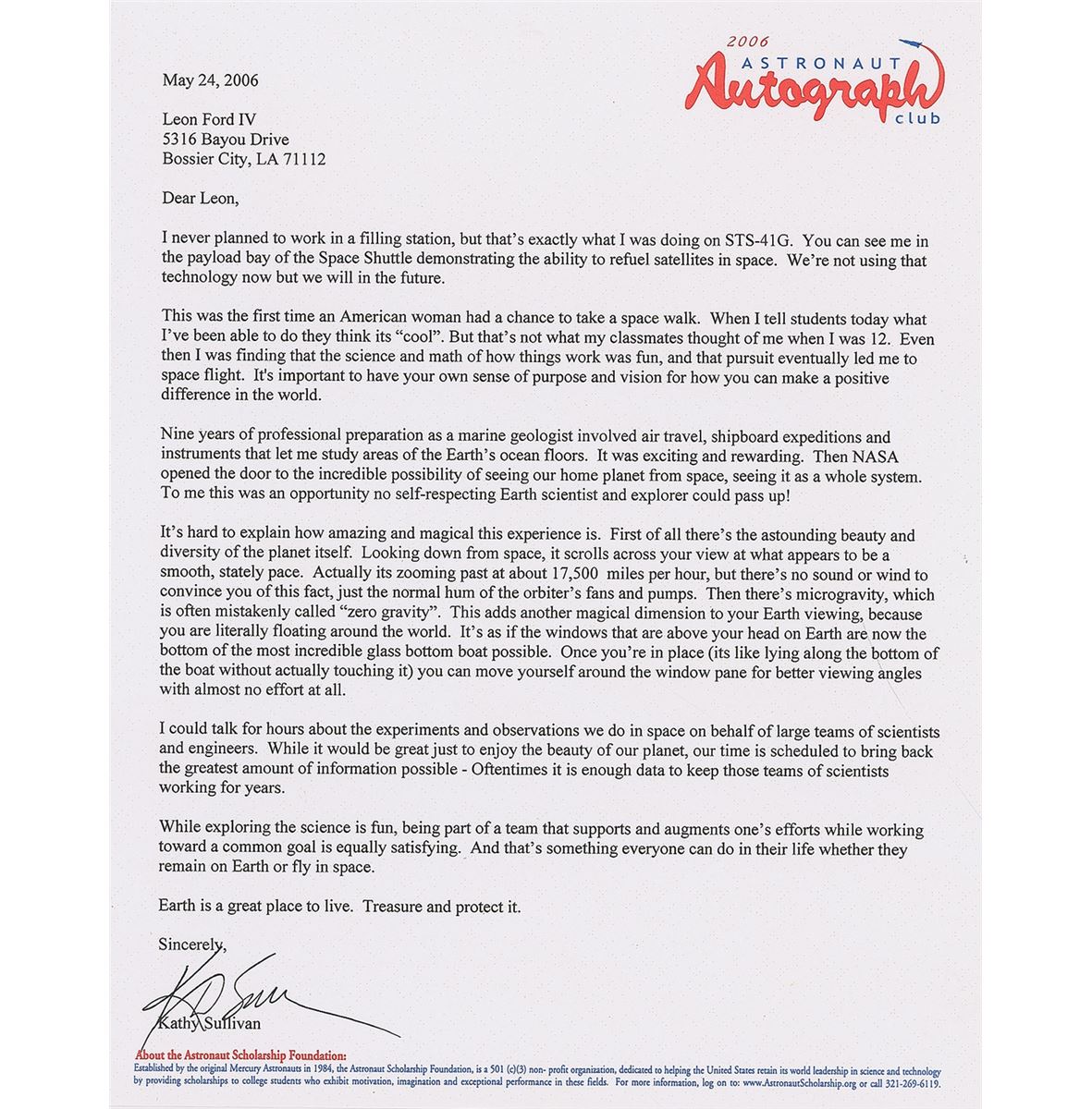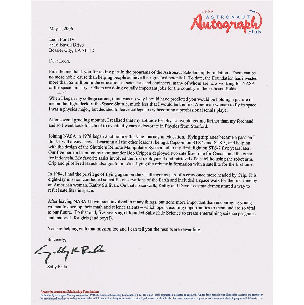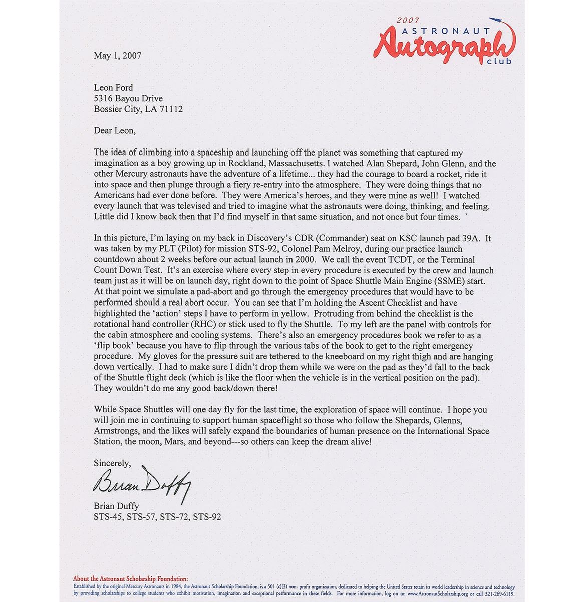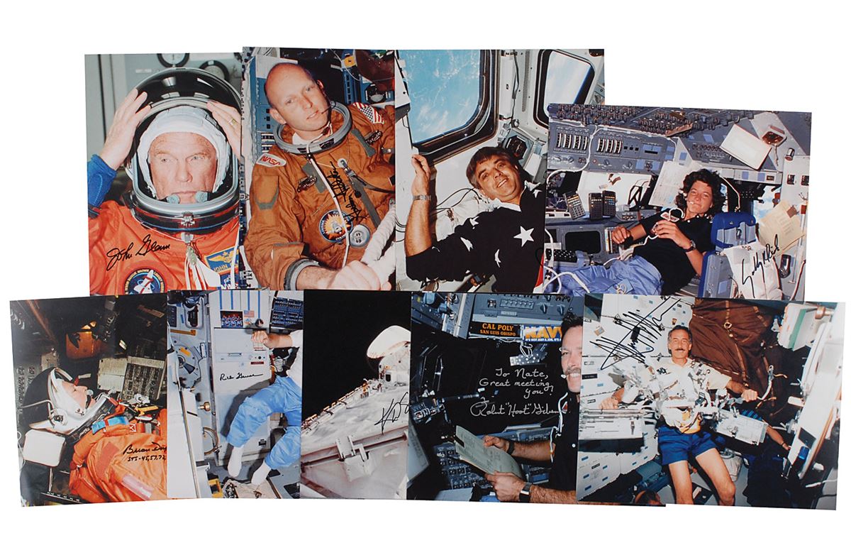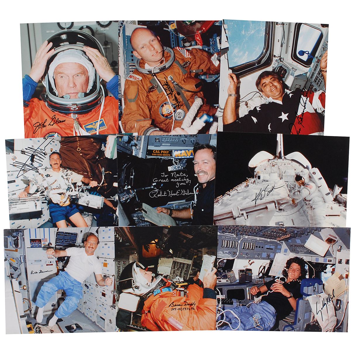 Nice assemblage of nine color satin-finish photos of various Space Shuttle astronauts, 8 x 10 and 10 x 8, each signed and inscribed in felt tip or ink by the astronaut pictured, including: John Glenn, Sally Ride, Gordon Fullerton, Dan Brandenstein, Brian Duffy, Rick Hauck, Kathy Sullivan, Robert Gibson (ins), and Jeffrey Hoffman. In overall fine condition. Accompanied by five Astronaut Autograph Club letters bearing preprinted signatures. From the Leon Ford Collection.