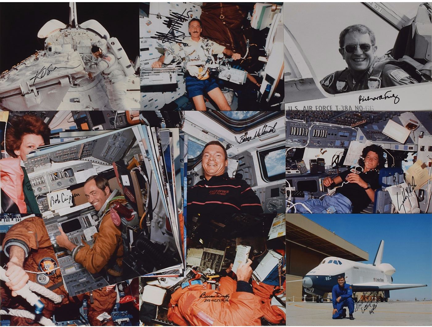 Impressive collection of 30 color semi-glossy or satin-finish photos of various Space Shuttle astronauts, 8 x 10 and 10 x 8, each signed in black felt tip by the astronaut pictured, including: Joe Allen, John Blaha, Charles F. Bolden, Dan Brandenstein, Mary Cleave, Eileen Collins, Dick Covey (2), Bob Crippen, Brian Duffy, Gordon Fullerton, Charles Gemar, Robert Gibson, John Glenn, Fred Gregory (2), Fred Haise, Jeff Hoffman, Tom Jones, Mark Lee, Jon McBride, Bruce McCandless II, Bruce Melnick, Story Musgrave, Sally Ride, Rhea Seddon, Kathryn Sullivan, Kathy Thornton, Richard Truly, and Don Williams. In overall fine to very fine condition.