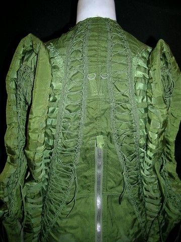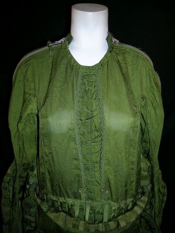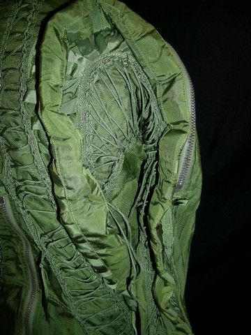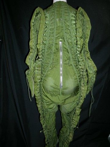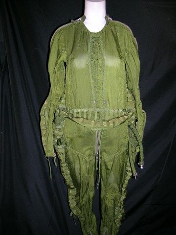 This is a green space suit from the 1996 film, starring Will Smith, Independence Day. The suit includes metal tipped tubing and zippers on the side and back. It was worn by a jet fighter pilot (a background character).