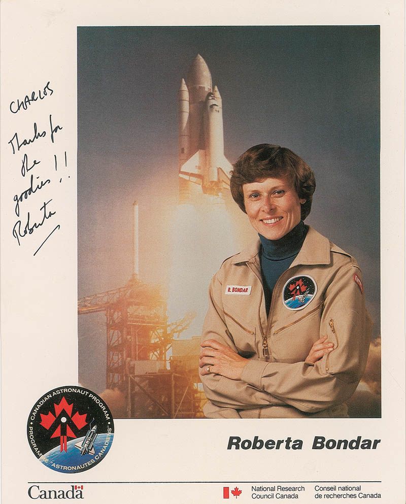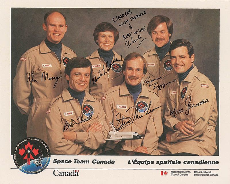 Two photos: color 10 x 8 cardstock photo of Space Team Canada, signed in black felt tip by Roberta Bondar, Ken Money, Bob Thirsk, Steve MacLean, Marc Garneau, and Bjarni Tryggvason, with an additional inscription added by Bondar, signing first name only; and a color 8 x 10 of Roberta Bondar, signed and inscribed in black felt tip. In fine condition.