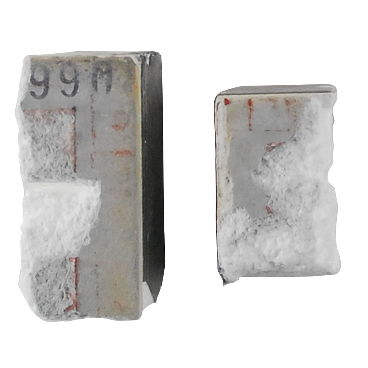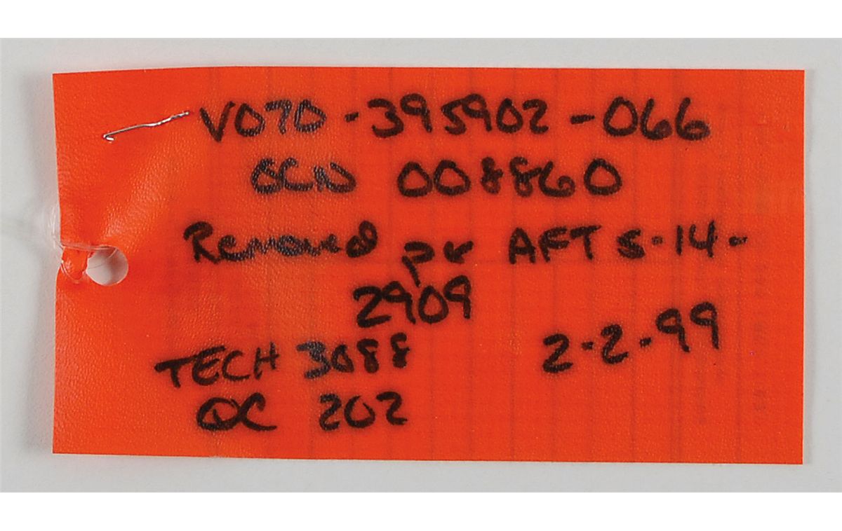 Available to US bidders only. Two small portions of black thermal protection tiles, both removed from the #2 engine dome of the shuttle Challenger. Accompanied by photocopies of two tile removal sheets and Kennedy Space Center discrepancy reports, detailing the removal of the tiles and marking them for “scrap.” Also included is an orange non-conforming material tag, labeled on the reverse in a technician’s hand. In fine condition.