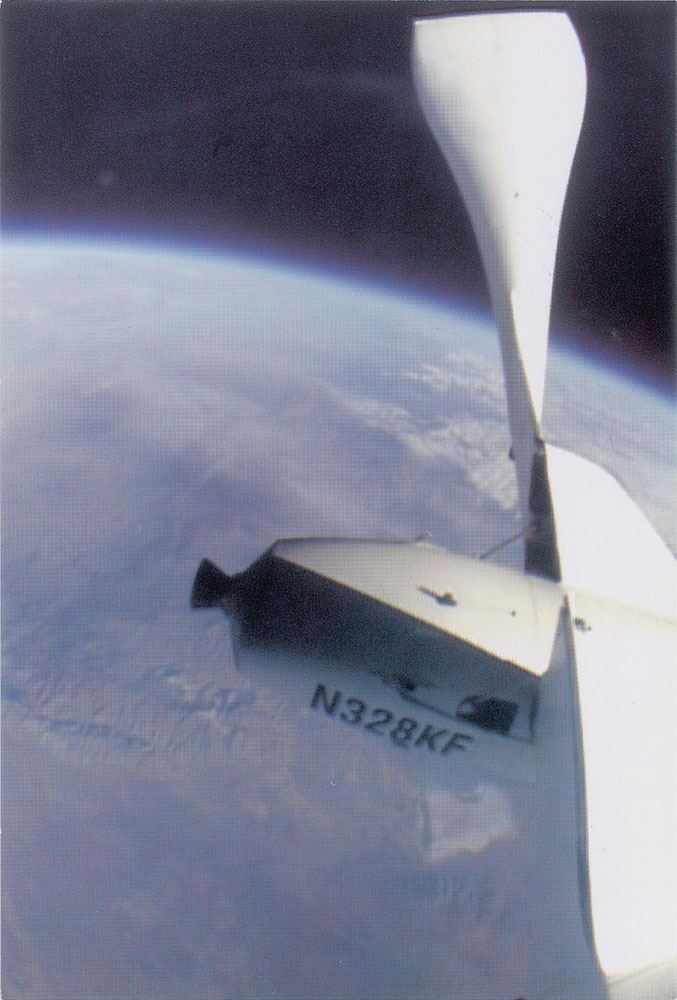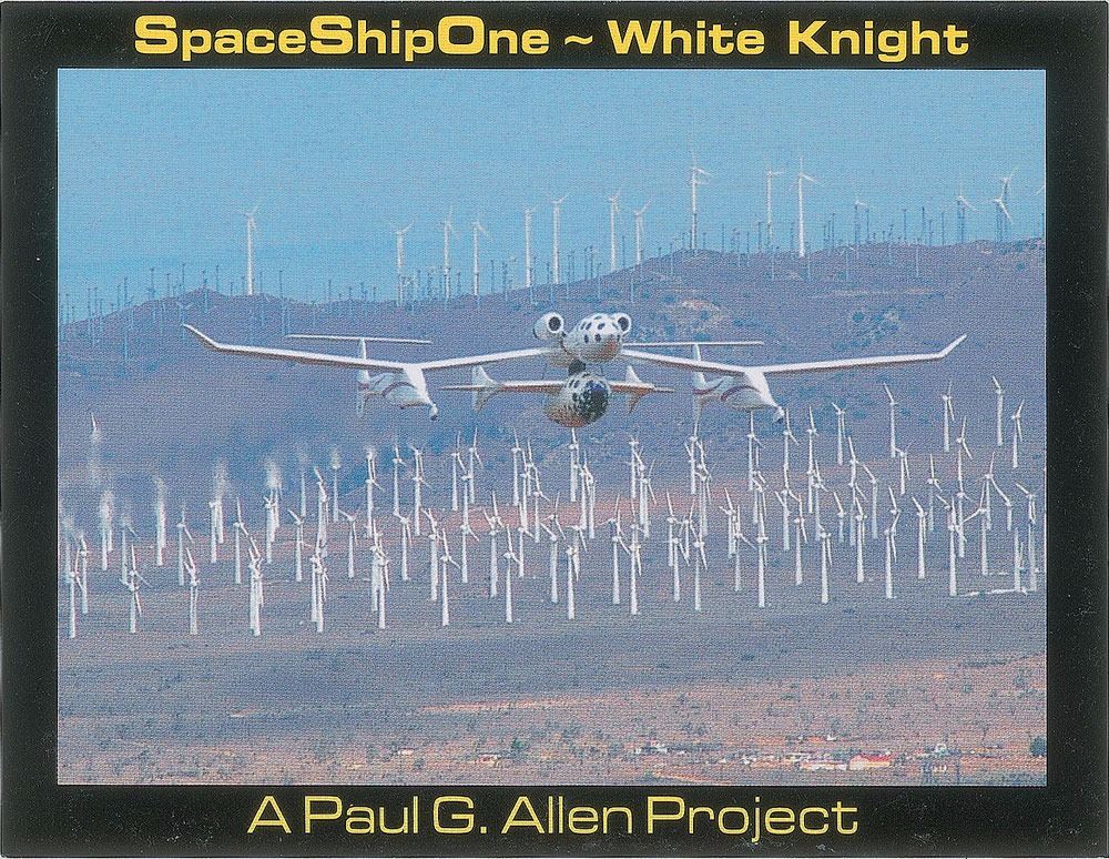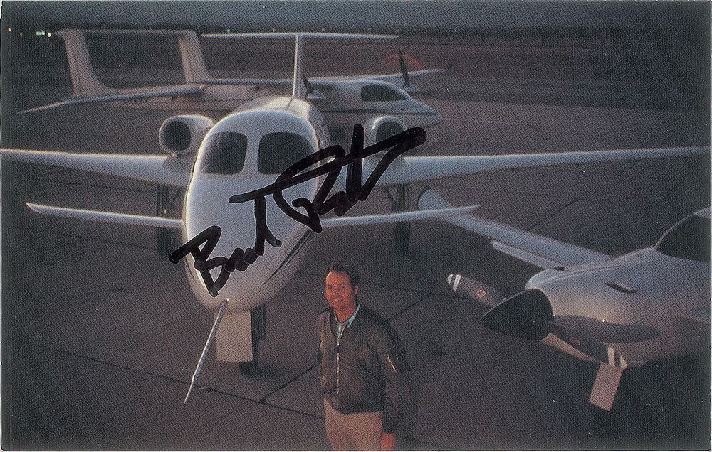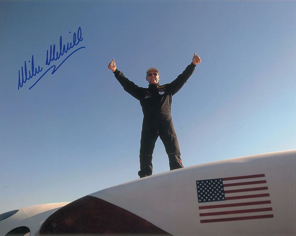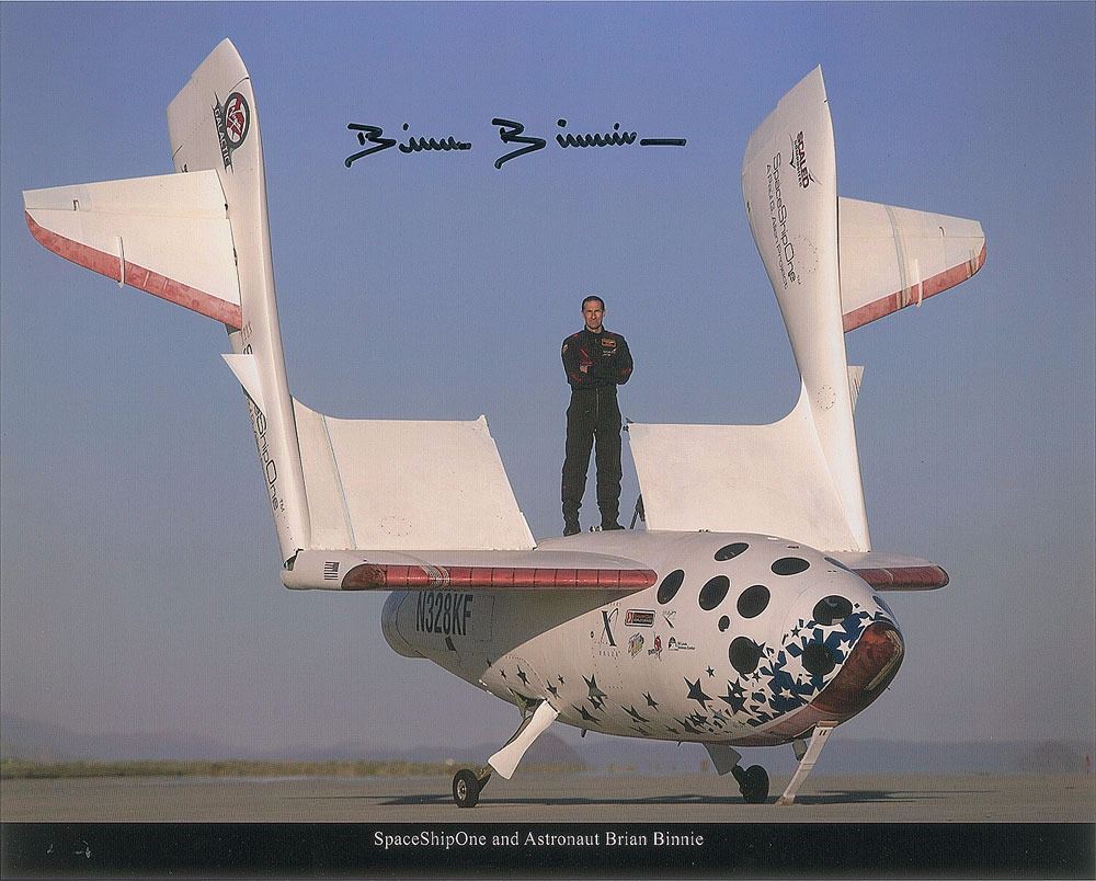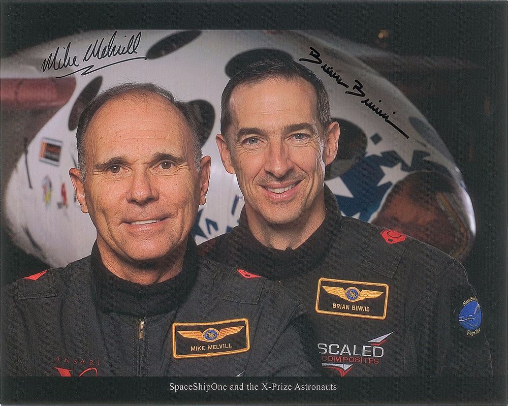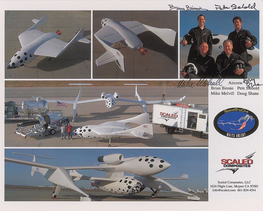 Five items signed by crew members of the SpaceShipOne: a color 10 x 8 cardstock photo of the ship and crew, signed in black felt tip by Brian Binnie, Pete Siebold, Mike Melvill, and Doug Shane; a color 10 x 8 paperstock photo of the SpaceShipOne crew, signed in black felt tip by Mike Melvill and Brian Binnie; a color 10 x 8 paperstock photo of Brian Binnie standing atop the ship, signed in black felt tip by Binnie; a color 5.5 x 3.5 cardstock photo of Burt Rutan on the tarmac, signed in black felt tip by Rutan; and a color 10 x 8 paperstock photo of Mike Melvill, signed in blue felt tip by Melvill. In overall fine condition. Accompanied by two photos of Brian Binnie with Bill Lende, as well as two postcards commemorating significant flights of the SpaceShipOne.