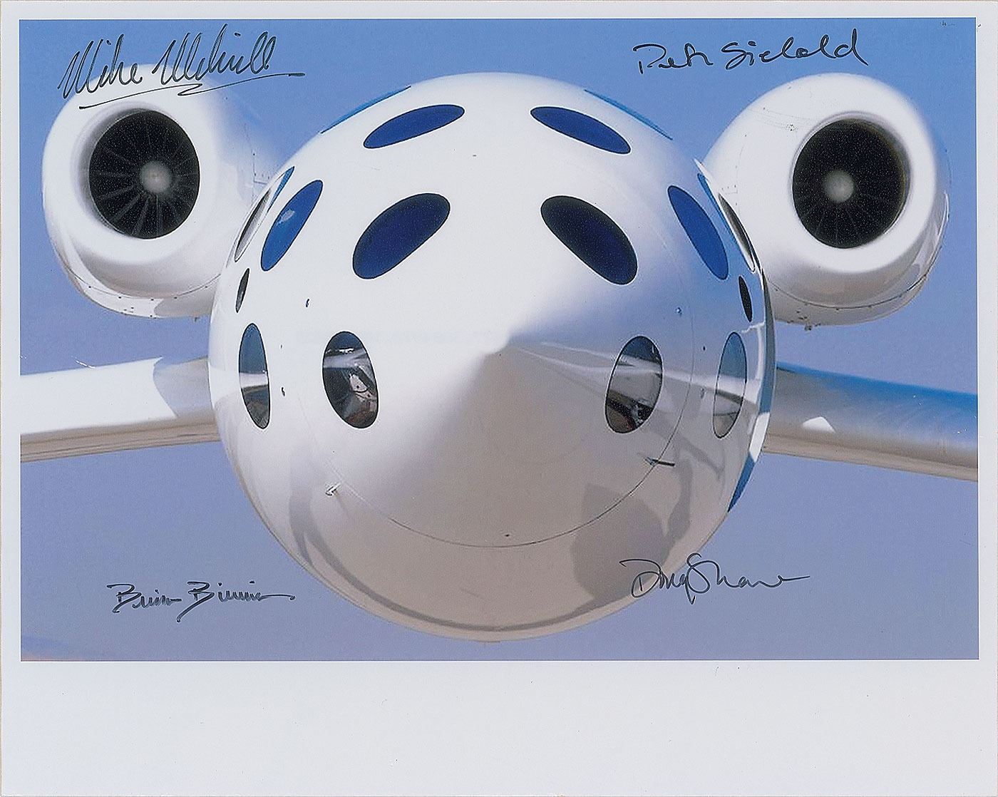 Color satin-finish 10 x 8 photo of the front of the SpaceShipOne, signed in black felt tip by Brian Binnie, Pete Siebold, Mike Melvill, and Doug Shane. In fine condition.