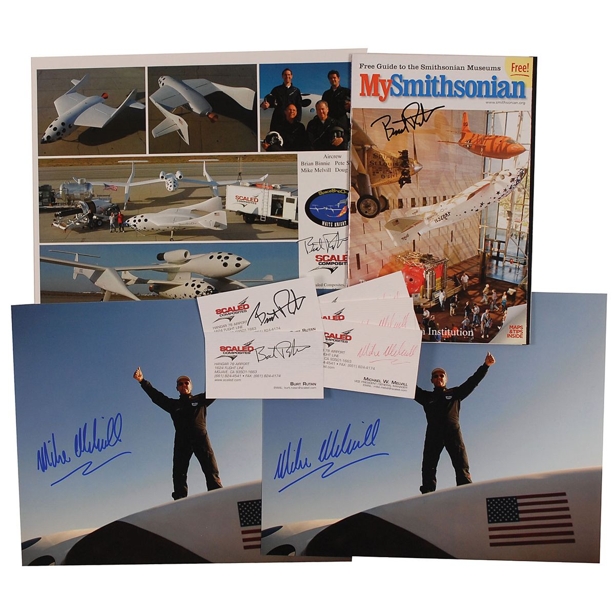 Nine items: color composite 10 x 8 photo of Space Ship One, signed in black felt tip by Burt Rutan; a My Smithsonian booklet, signed on the front cover by Rutan; two of Rutan’s Scaled Composites business cards, both signed in black felt tip; three of Melvill’s Scaled Composites business cards, each signed in red ink; and two color 10 x 8 paperstock photos of Melvill standing atop his spacecraft, each signed in blue felt tip. In fine condition.