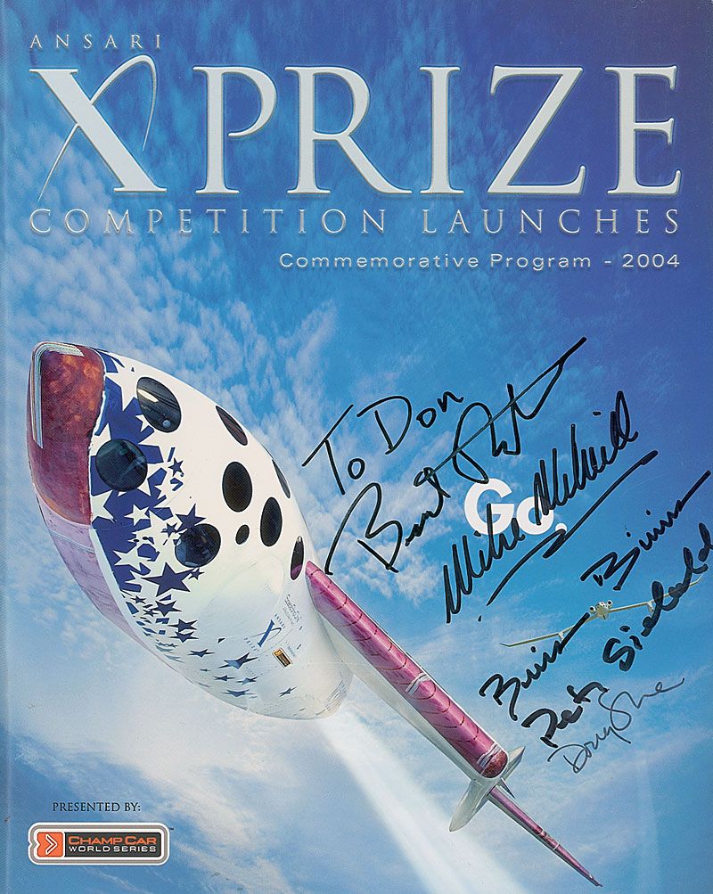 Ansari X Prize Competition program, 8 x 10, 48 pages, signed on the front cover in black felt tip by Burt Rutan (ins), Mike Melvill, Pete Siebold, Brian Binnie and Doug Shane. In fine condition.