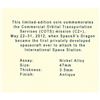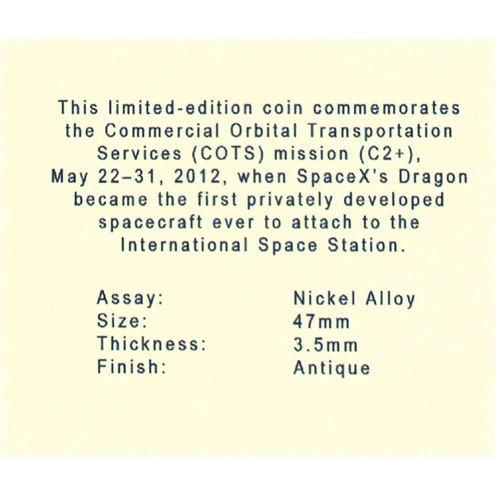 Limited edition coin commemorating the Commercial Orbital Transportation Services mission and the SpaceX Dragon spacecraft. Nickel alloy, 44 mm, 48 gm. The front features a raised emblem with Falcon 9 launch vehicle and surrounding text: "SpaceX-COTS Demo 2+, Falcon 9, Dragon"; and the reverse depicts the Dragon spacecraft floating towards the ISS, with encircled text: "First Commercial Spacecraft to Visit ISS, 5-25-2012." In very fine condition. Accompanied by a certificate of authenticity from SpaceX. This commemorative coin was only available to SpaceX employees.