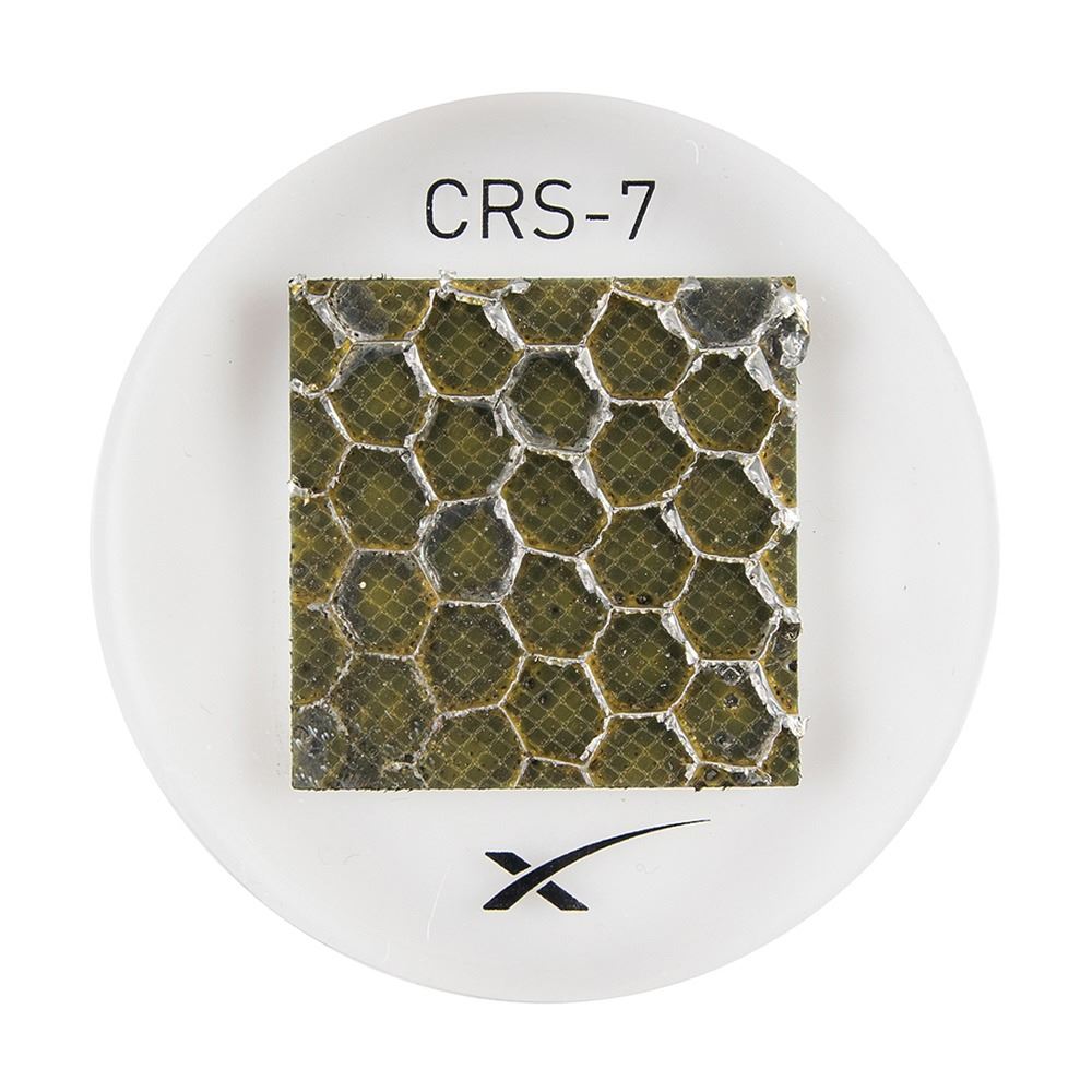 Flown segment of the Dragon's solar array structure recovered after the failed CRS-7 mission on June 28, 2015, measuring 1.25Ë x 1.25Ë, encased 2.25Ë Lucite marked with the SpaceX logo and "CRS-7." Accompanied by a descriptive card, noting: "This portion of the Dragon's solar array structure from the failed CRS-7 mission serves as a reminder that launching safely and reliably is everyone's duty. Always triple-check your work, check the work of others, and together we will continue to make history." In very fine condition.