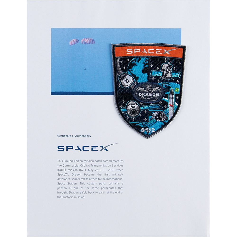 Appealing embroidered SpaceX employee patch commemorating SpaceX COTS Demo Flight 2, 3.5" x 4.5", incorporating an orange swatch of parachute flown on the mission at the top. Affixed to an 8.5" x 11" certificate which reads: "This limited-edition mission patch commemorates the Commercial Orbital Transportation Services (COTS) mission (C2+), May 22-31, 2012, when SpaceX's Dragon became the first privately developed spacecraft ever to attach to the International Space Station. This custom patch contains a portion of one of the three parachutes that brought Dragon safely back to earth at the end of the historic mission." In very fine condition.