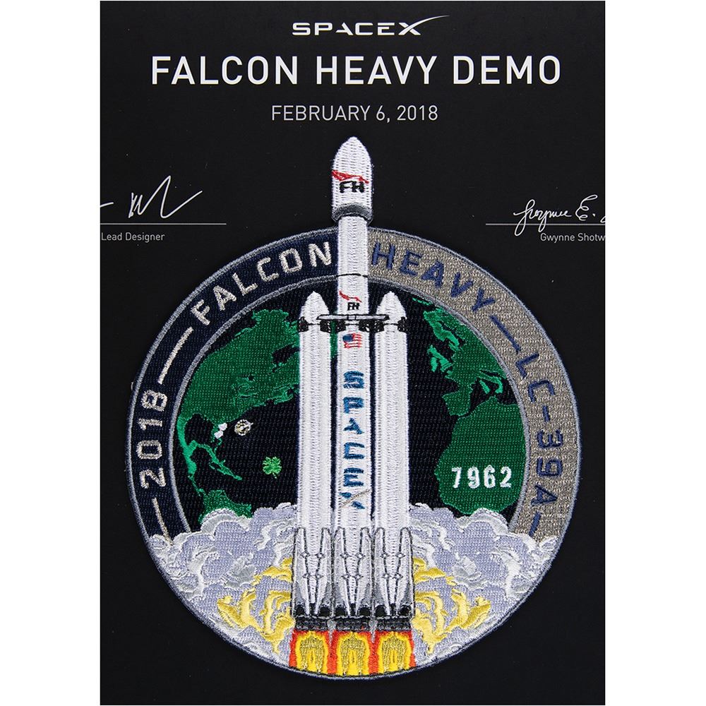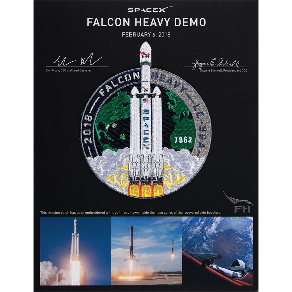 Attractive embroidered patch for the SpaceX Falcon Heavy Demo test flight that launched from Cape Kennedy LC-39A on February 6, 2018, measuring 5″ x 6″ and affixed to an attractive 8.5″ x 11″ presentation sheet, which states: "This mission patch has been embroidered with red thread flown inside the nose cones of the recovered side boosters." The certificate features facsimile signatures of Elon Musk and Gwynne Shotwell. In very fine condition.