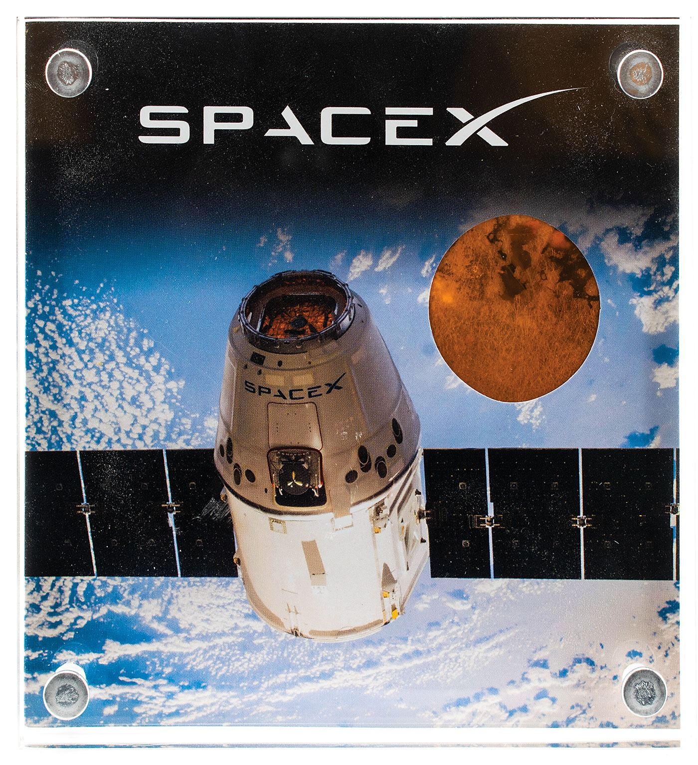 Limited edition flown swatch of multi-layer insulation (MLI) from the Draco thruster of the Dragon CRS spacecraft, which launched as part of the SpaceX CRS-3 mission on April 18, 2014. The swatch measures 1.5? in diameter and is presented in a plastic 5.75? x 5.75? display case with certificate of authenticity numbered 260/550. In fine condition.