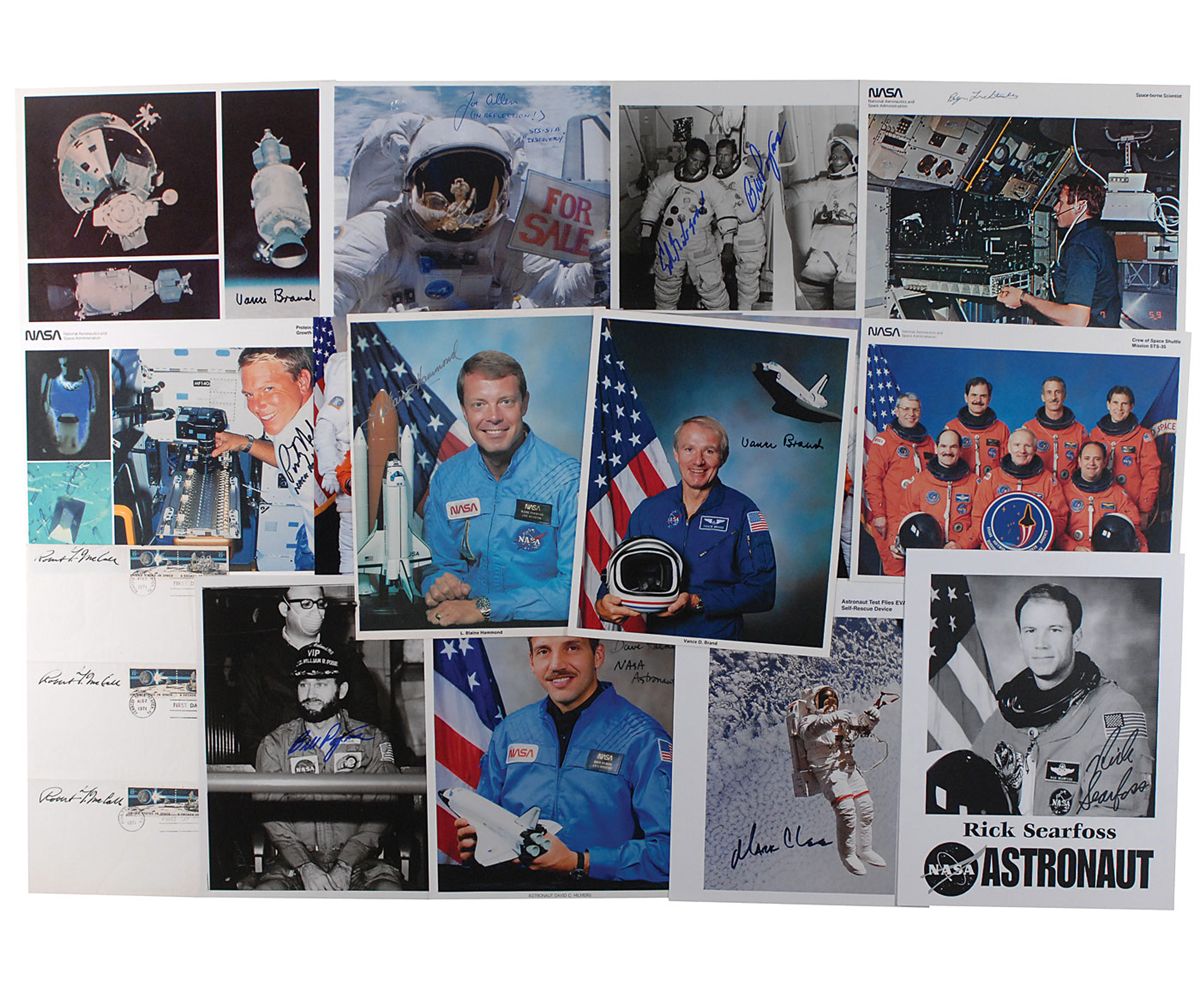Fifteen items, consisting primarily 8 x 10 and 10 x 8 photos, each signed by the associated astronaut(s) or space notable. Signers are: Vance Brand (2), Joe Allen, Bill Pogue, Bill Pogue and Ed Gibson, Dave Hilman, Mark C. Lee, L. Blaine Hammond, Byron K. Lichtenberg, Rick Searfoss, George ‘Pinky’ Nelson, Robert McCall, STS-114 (2, Andrew S. W. Thomas, Charles J. Camarda, and James M. Kelly), and James M. Kelly. In overall fine condition. Accompanied by two unsigned NASA photos and two unsigned press placards.