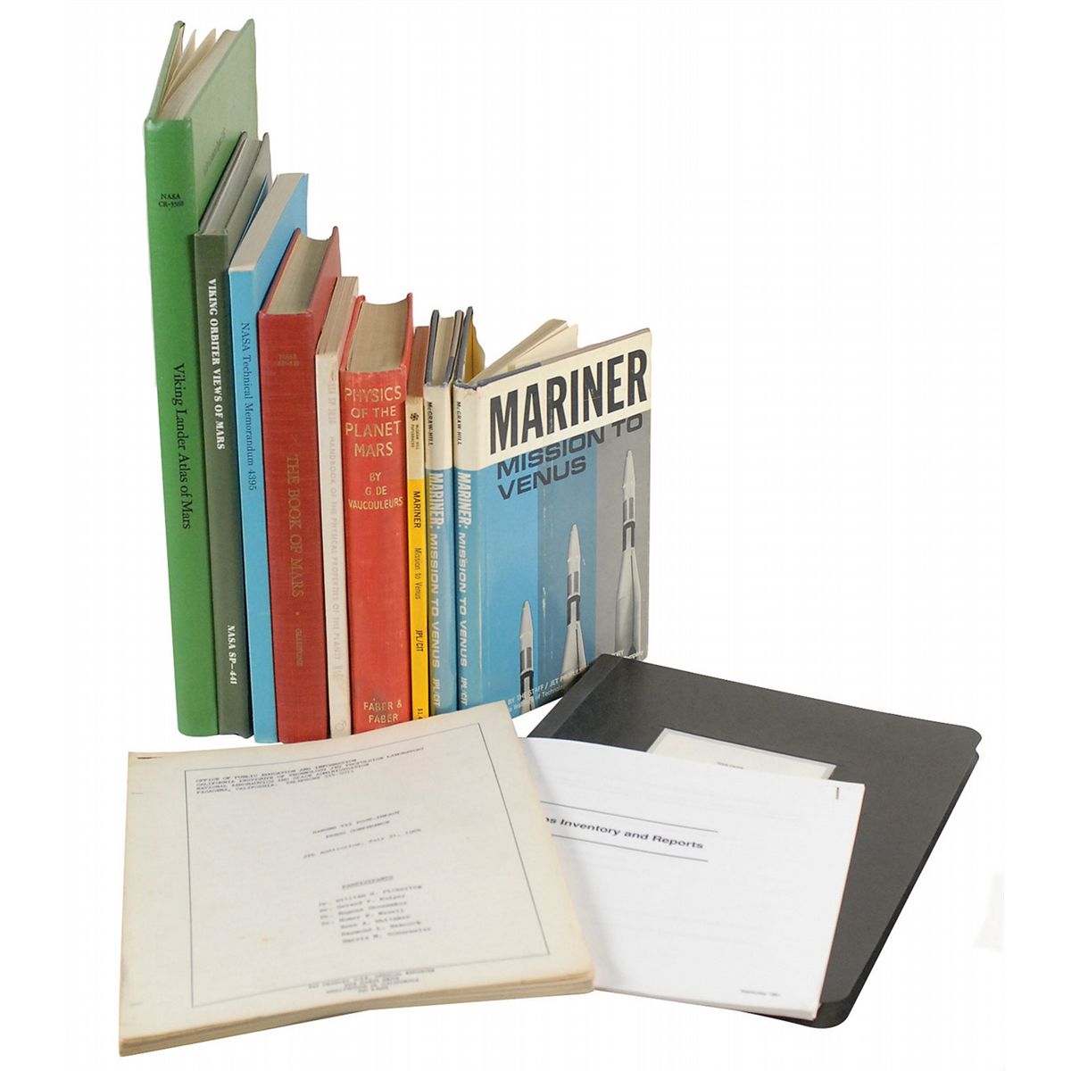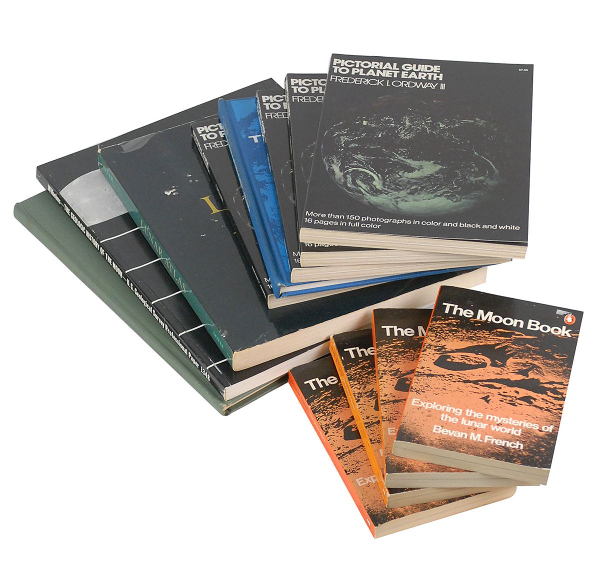 Collection of 25 space-related books and manuals. Titles include: Viking Lander Atlas of Mars; Viking Orbiter Views of Mars; a brad-bound script for a NASA movie on Mariner; a transcript from a 1964 Ranger VII press conference; Physics of the Planet Mars; Mariner Mission to Venus; Handbook of the Physical Properties of the Planet Mars; The Moon Book (4, two signed by author Bevan M. French); The Moon: Its Geology and Geography; Pictorial Guide to Planet Earth (4, three signed by author Frederick I. Ordway III); The View from Space, signed by author Bruce Murray); Lunar Atlas; The Moon as Viewed by Lunar Orbiter; and The Geologic History of the Moon. In overall very good to fine condition.