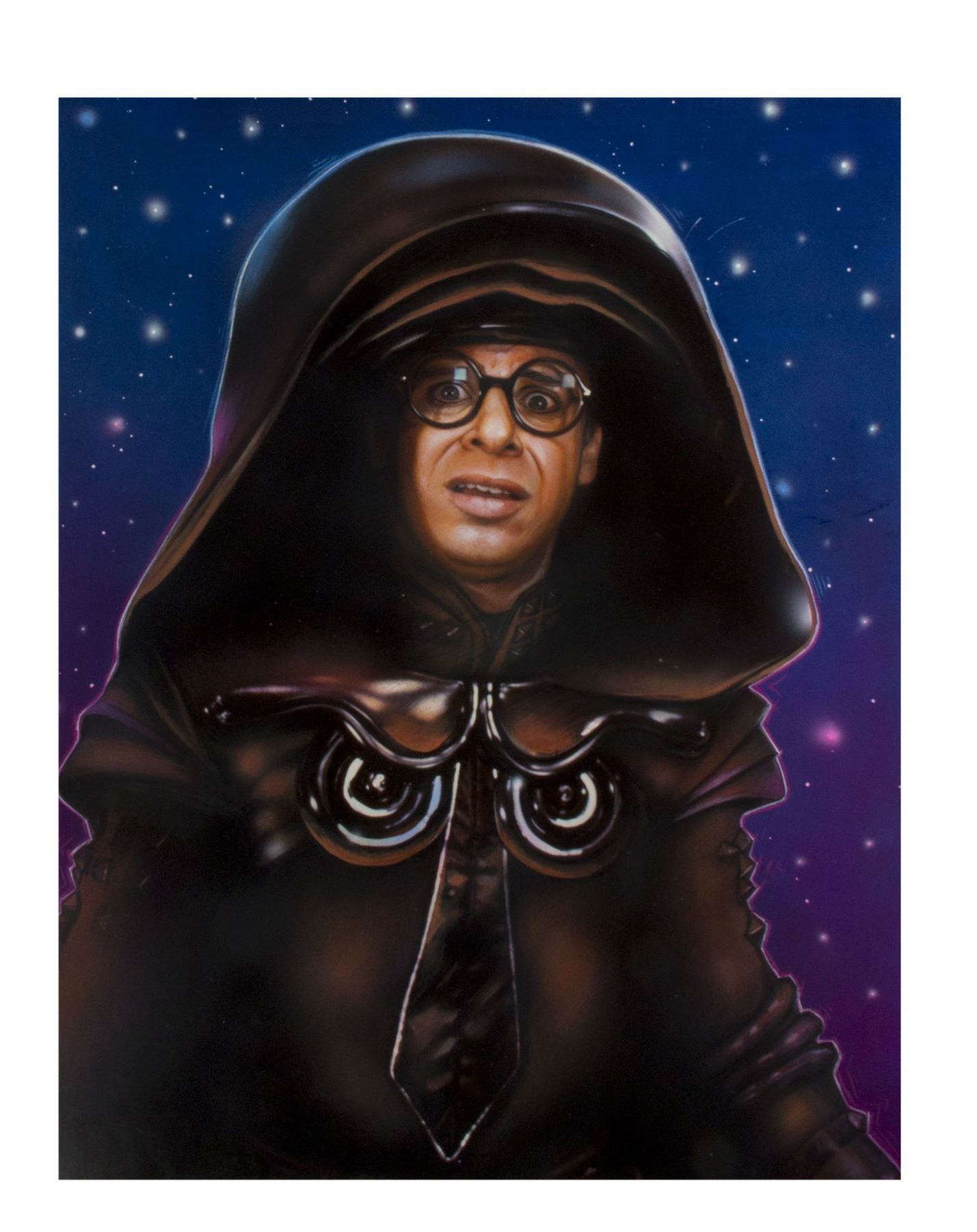 (MGM, 1987) An original painting of the character Dark Helmet from "Spaceballs" that was used in the promotion of the film's theatrical release. The artwork was created by using an underlying photo of the character, which was then painted over. There are prominent areas of original airbrushing throughout the character that are unique to this artwork, including the space background which is entirely hand-painted. Measuring 20"x16", the artwork has clear and paper protective layers hinged over the imagery. The condition is very good with some wear throughout, including a portion in the top-right of the background that has a glossy quality to it from prolonged contact with the clear sheet.