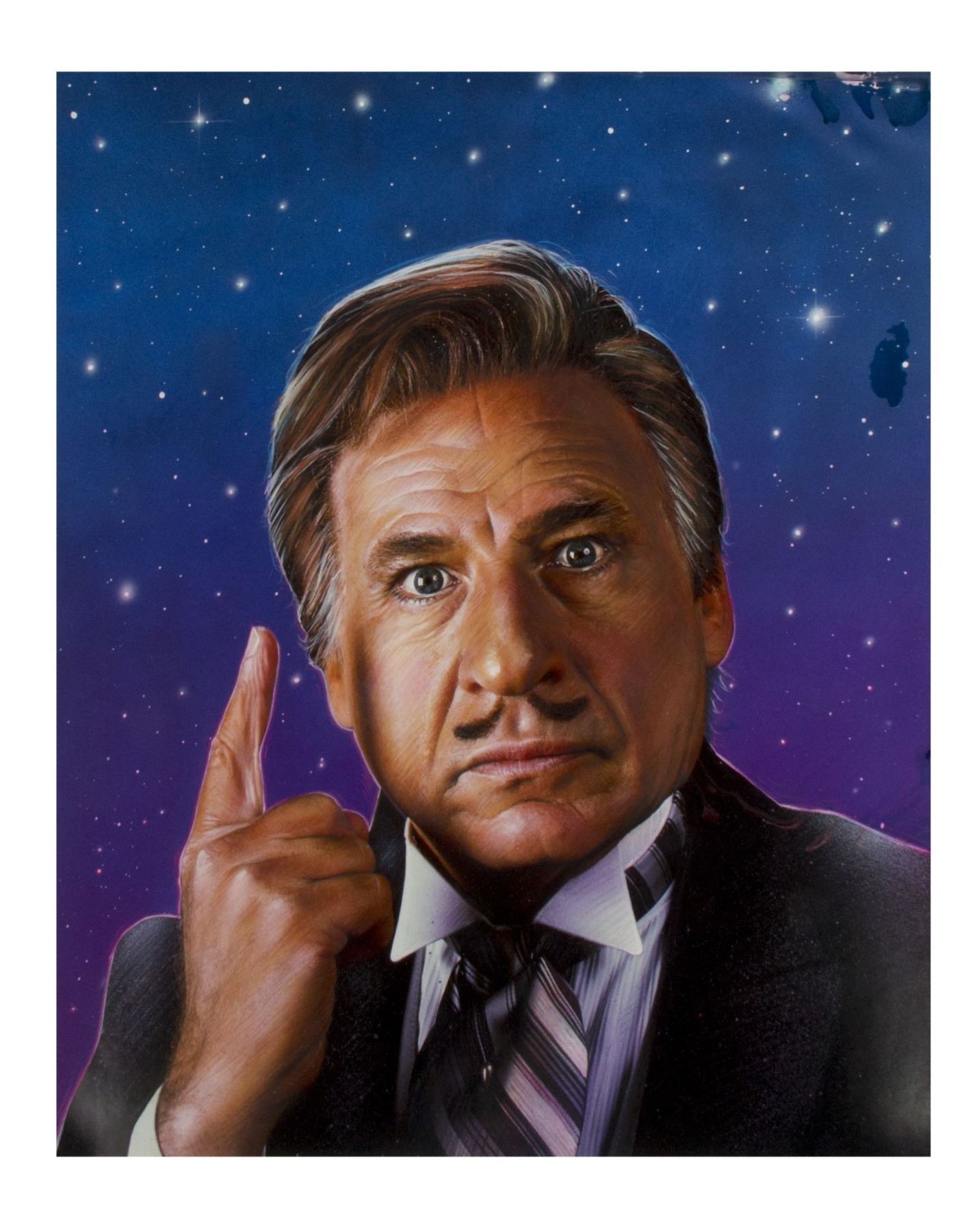 (MGM, 1987) An original painting of the character Skroob from "Spaceballs" that was used in the promotion of the film's theatrical release. The artwork was created by using an underlying photo of the character, which was then painted over. Prominent areas of original airbrushing are visible throughout the character and includes the space background which is entirely hand-painted. Measuring 20"x16", the artwork has clear and paper protective layers hinged over the imagery. The condition is fair with some moisture damage and color wear throughout that have created a glossy quality to portions of the artwork.