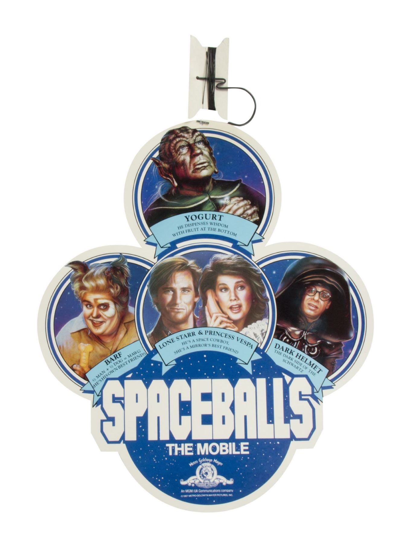 (MGM, 1987) A promotional display cardstock mobile created for the theatrical release of "Spaceballs". The mobile is unused with its original hanging cord and metal hook still attached. The mobile is double-sided and displays several of the main characters including the heroes and Dark Helmet. The mobile measures 18"x15.5", not including the hanging equipment, and is in very good condition with a few minor creases and some edge-wear.