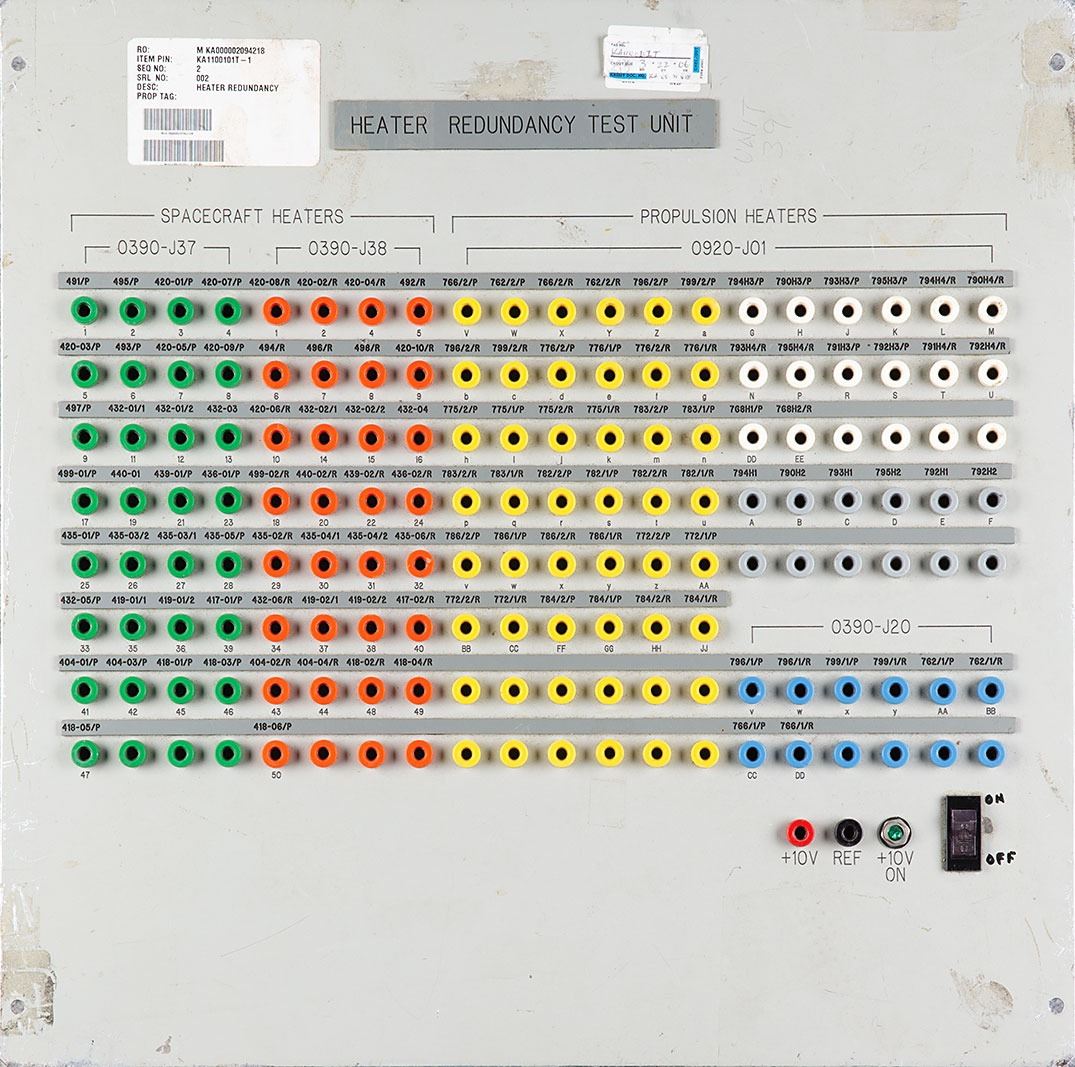 Spacecraft Heater Redundancy Test Unit Patch Panel, measuring 17? x 17?, with a plate reading "Heater Redundancy Test Unit" at the top. The patch panel features 154 colorful ports, identified as corresponding to "Spacecraft Heaters" and "Propulsion Heaters." In fine condition. Ideal as a potential movie prop or piece of wall art.