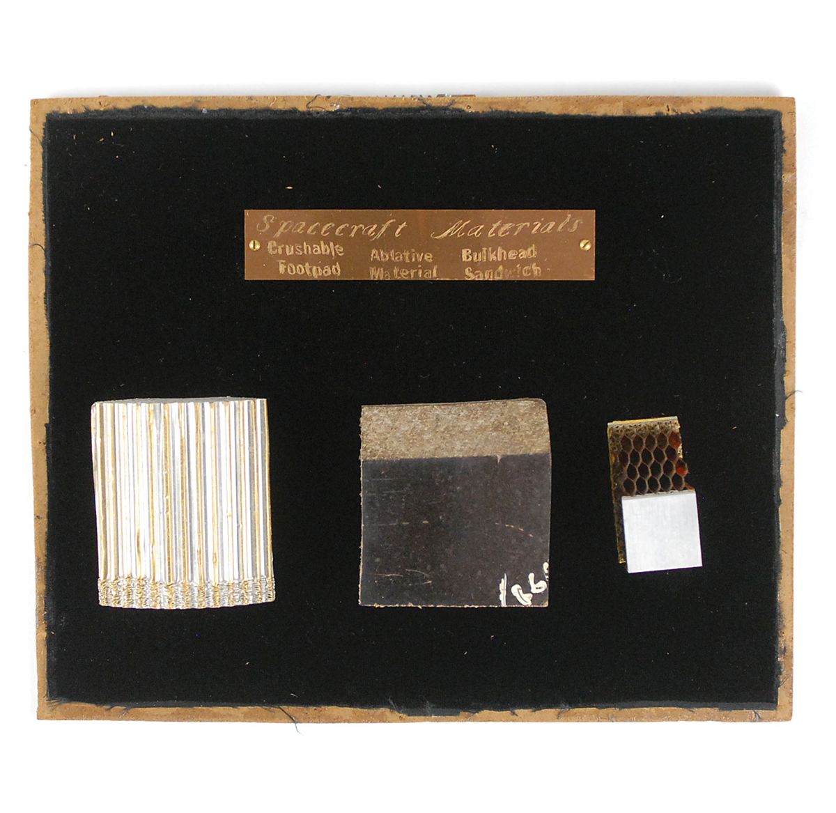 Three samples of spacecraft structure and thermal protection system materials. A 2.5 x 3 sample of crushable footpad; a 2.5 x 3 wedge of ablative material, and a 1 x 2.25 portion of honeycomb bulkhead. All three are affixed to an 11 x 9 board along with an engraved plaque. In fine condition. All three of these materials would be used to protect a space vehicle from the high temperatures encountered during re-entry.