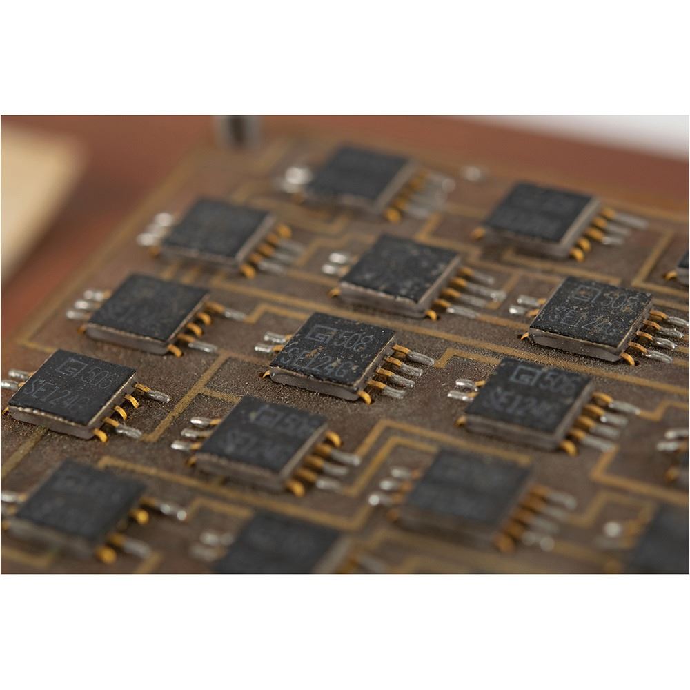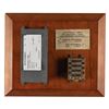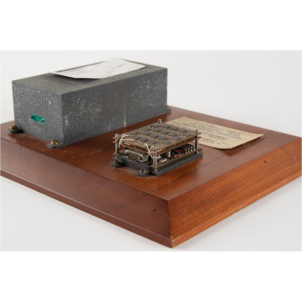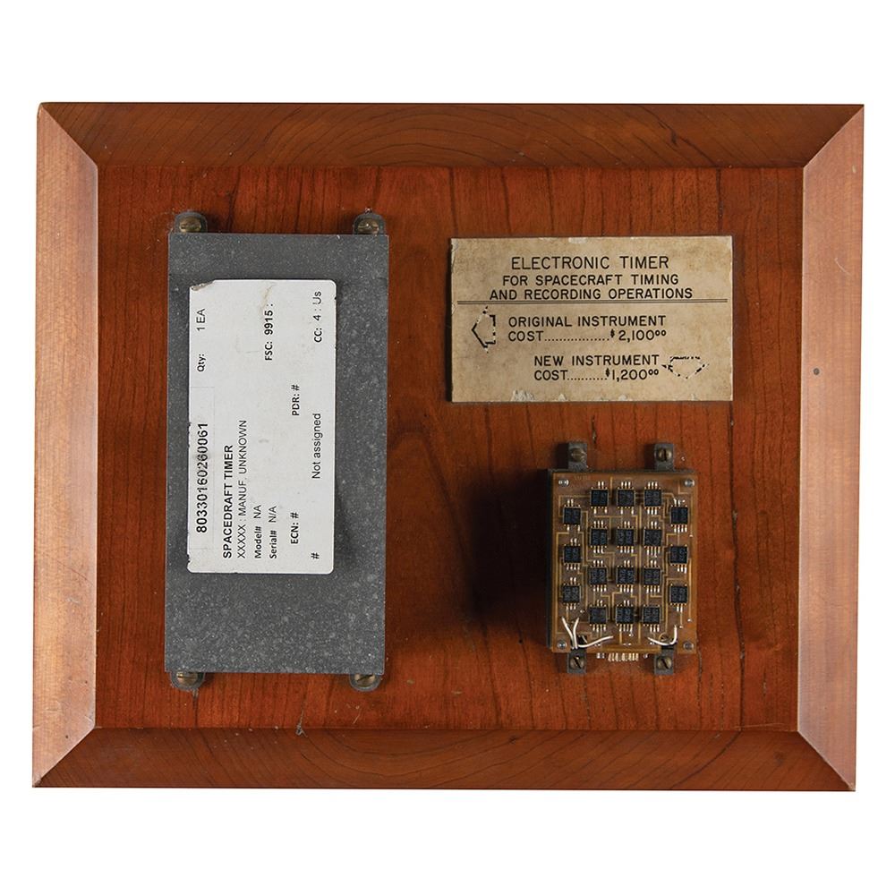 Display plaque featuring two varieties of an "electronic timer for spacecraft timing and recording operations," measuring 12è x 10è x 3è overall, showing a larger "original instrument" which cost $2100, and a smaller "new instrument" which cost $1200. The case of the timer on the right side has been removed to show the integrated circuits that allowed the improved, lower-cost design. An inventory label has been affixed to the timer on the left.
