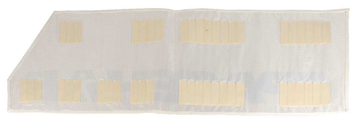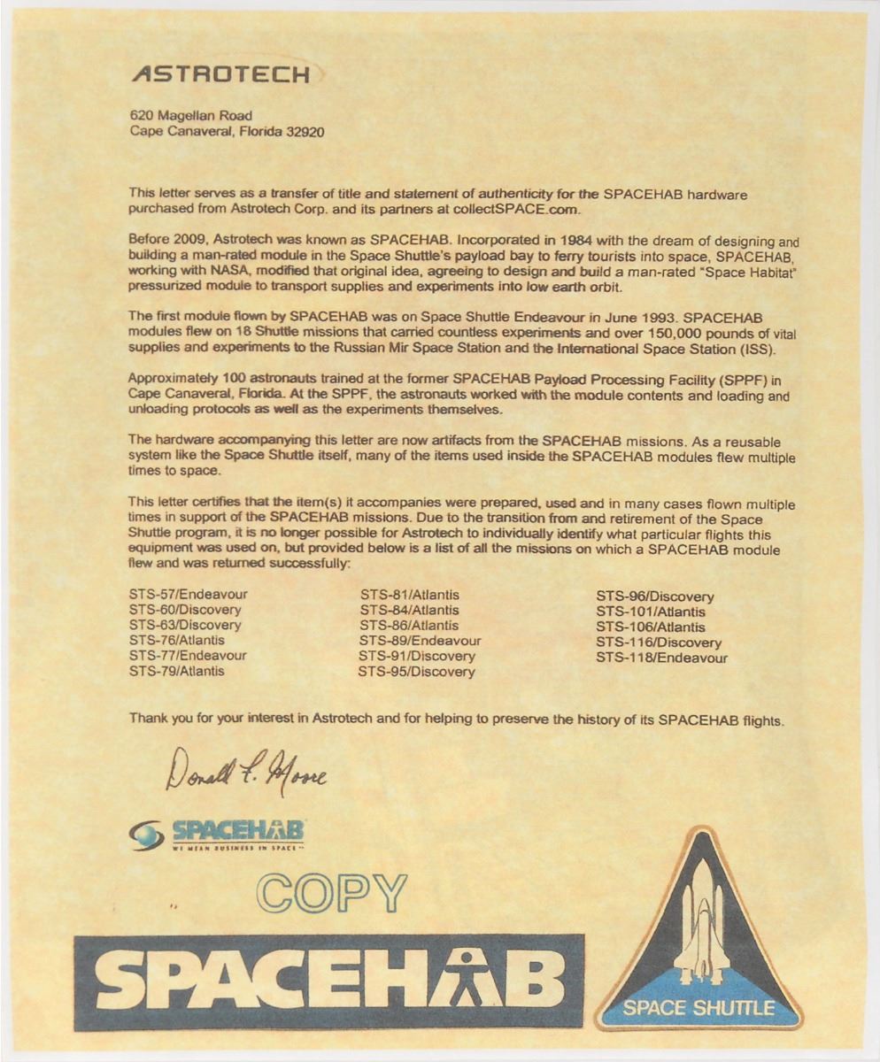 White beta cloth sign with large blue lettering, “Spacehab,” 44 x 18, featuring numerous swatches of velcro on the reverse. In fine condition. Accompanied by a photocopied letter of authenticity from Spacehab. From the collection of aerospace memorabilia specialist Ken Havekotte.