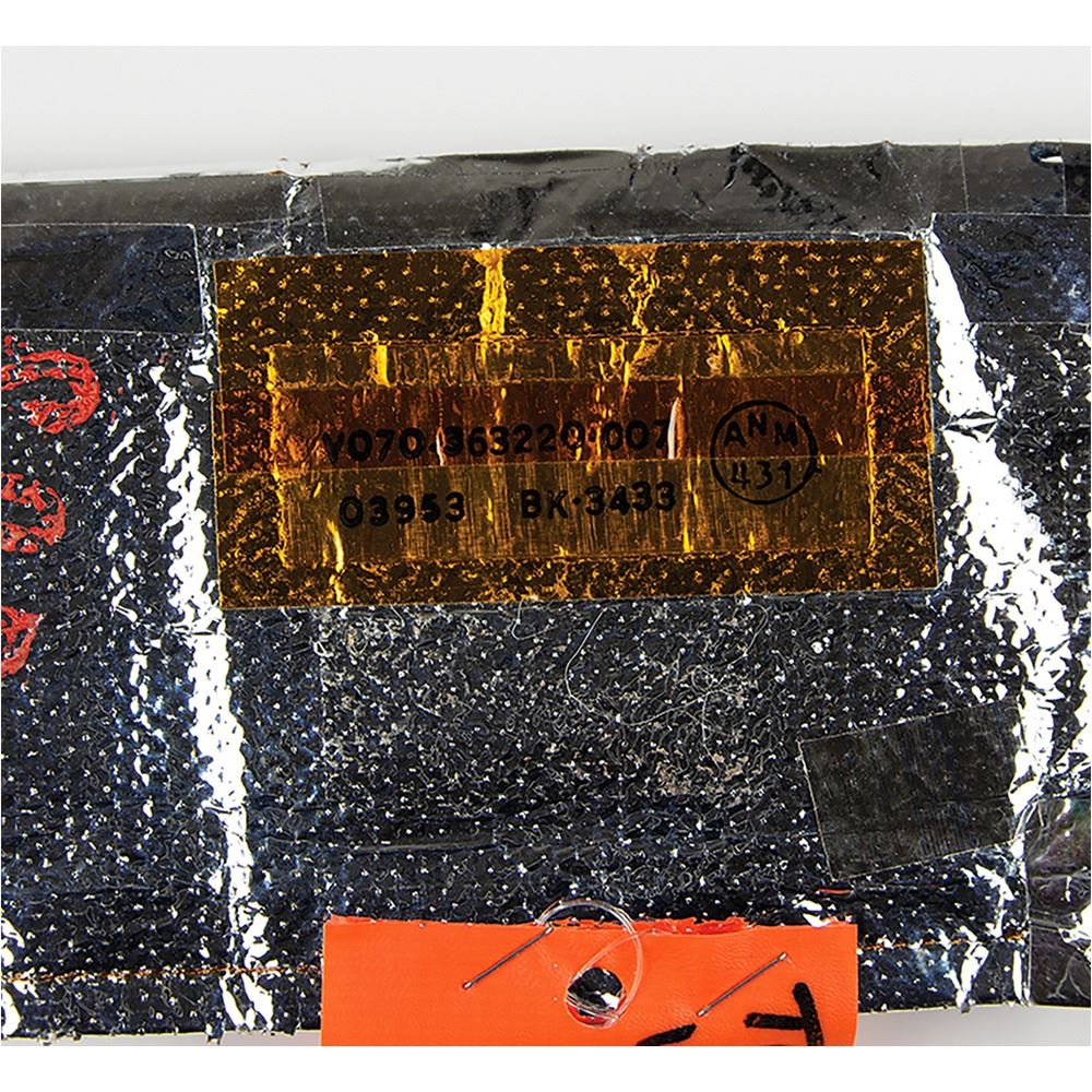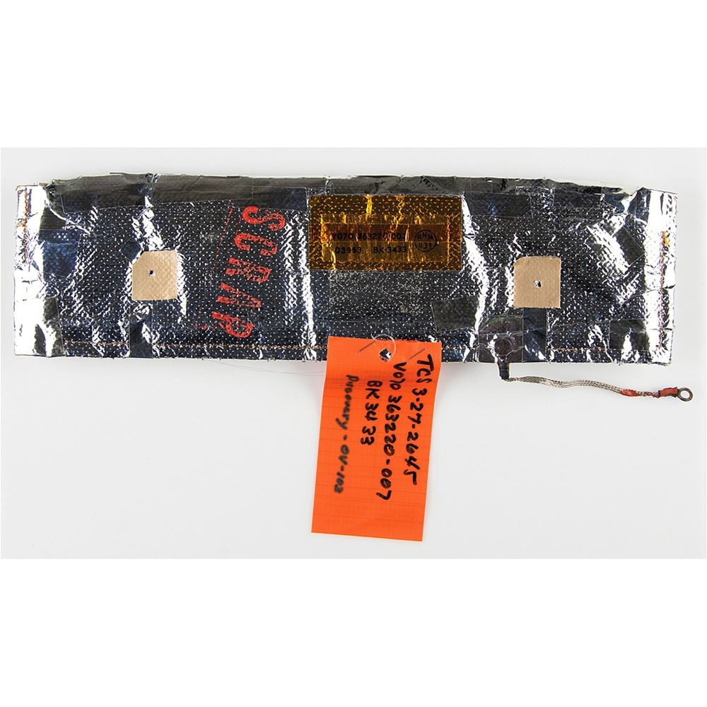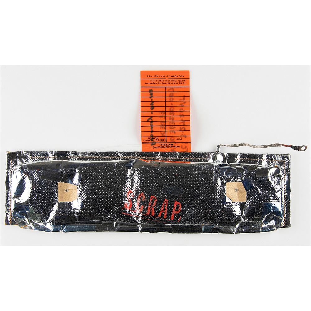 Attested to as flown by Astrotech‰ÛÓa piece of insulation material carried on the Space Shuttle Discovery Orbiter as part of a SPACEHAB mission, measuring 14.5 x 3.75, composed of fibrous Mylar with mounting holes to either side, a yellow parts label to reverse, ‰ÛÏV070-363220-007, 03953, BK-3433,‰Û and a stapled ‰ÛÏNon-Conforming Material‰Û tag marked ‰ÛÏTCS 3-27-2645, V070 363220-007, BK 3433, Discovery-OV-103.‰Û Both sides are stamped in red, ‰ÛÏSCRAP.‰Û