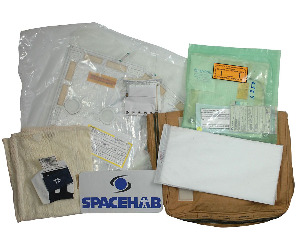 Collection of Spacehab hardware and materials, including: a canvas flight bag; small sign; mesh liner; armband; and thermal material. In overall fine condition. Accompanied by a letter from Spacehab stating that the items “were prepared, used and in many cases flown multiple times in support of the SPACEHAB missions.”