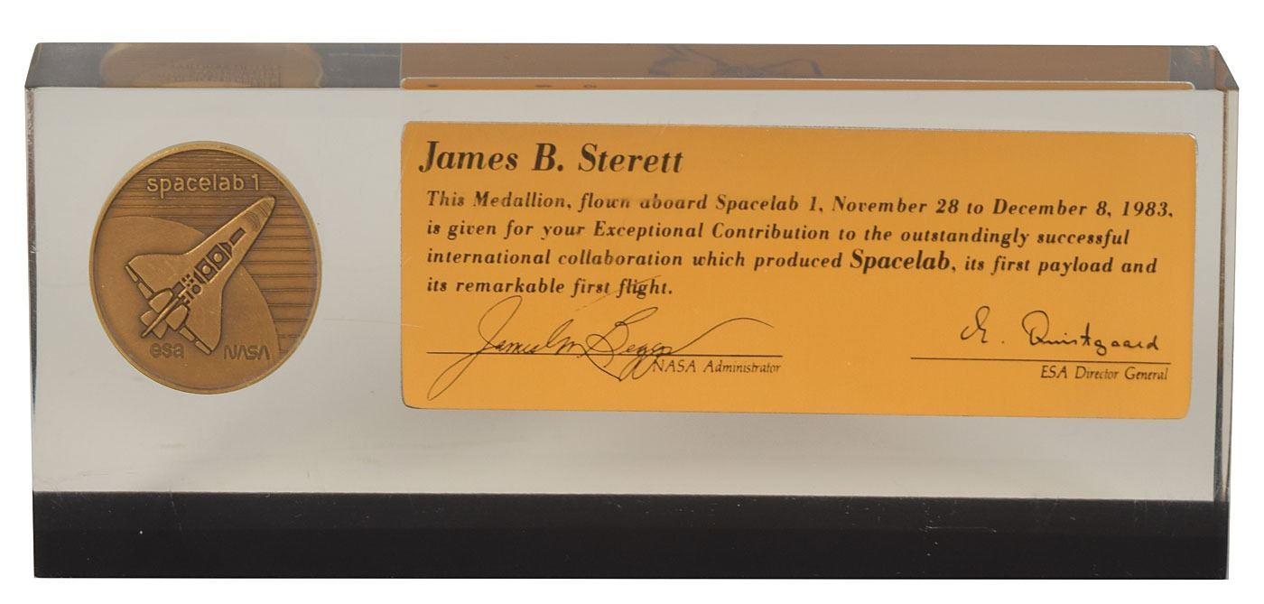Flown Spacelab 1 commemorative medallion minted by the European Space Agency (ESA) and carried on STS-9 as part of the first Spacelab module, encased in an 8 x 3 x 1 Lucite block beside a presentation plaque, reading: "James B. Sterett: This Medallion, flown aboard Spacelab 1, November 28 to December 8, 1983, is given for your Exceptional Contribution to the outstandingly successful international collaboration which produced Spacelab, its first payload and its remarkable first flight." The plaque bears facsimile signatures of NASA and ESA officials. In fine condition, with a few minor scratches to the Lucite. Accompanied by a copy of the STS-9 flight kit stowage list, which states that 768 Spacelab 1 medallions were carried on the mission.