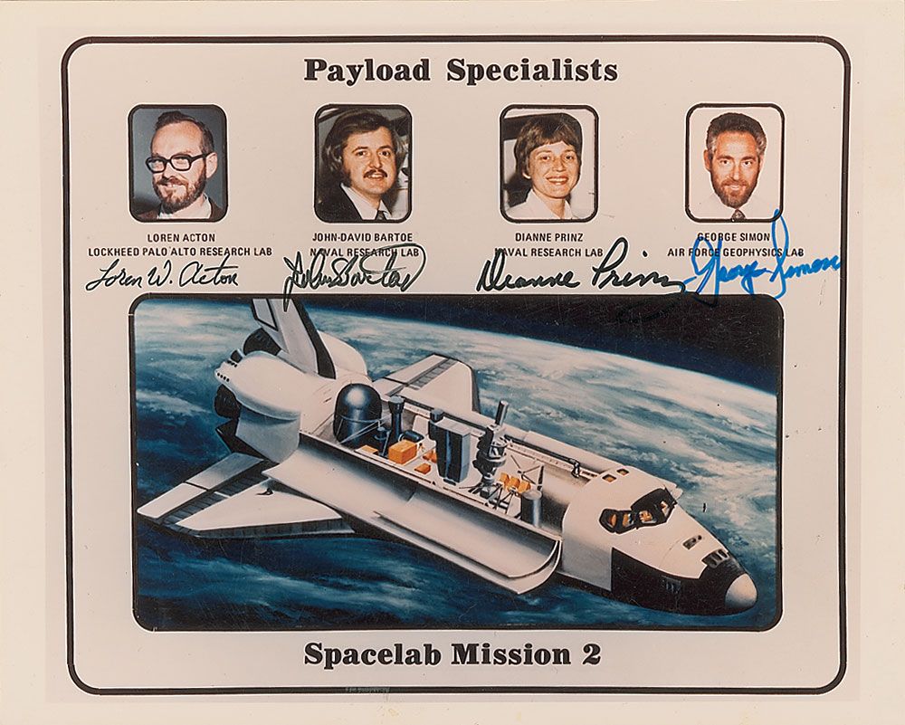 Color glossy 10 x 8 composite photo of the Spacelab Mission 2 payload specialists and the shuttle, signed in black felt tip by all four specialists: Loren W. Acton, John-David Bartoe, Dianne Prinz, and George Simon. Scattered light creases, otherwise fine condition. The experiments conducted as part of the mission included solar physics, plasma physics, and the use of the Spacelab Infrared Telescope. An uncommon image highlighting the scientific aspect of this valuable shuttle mission.