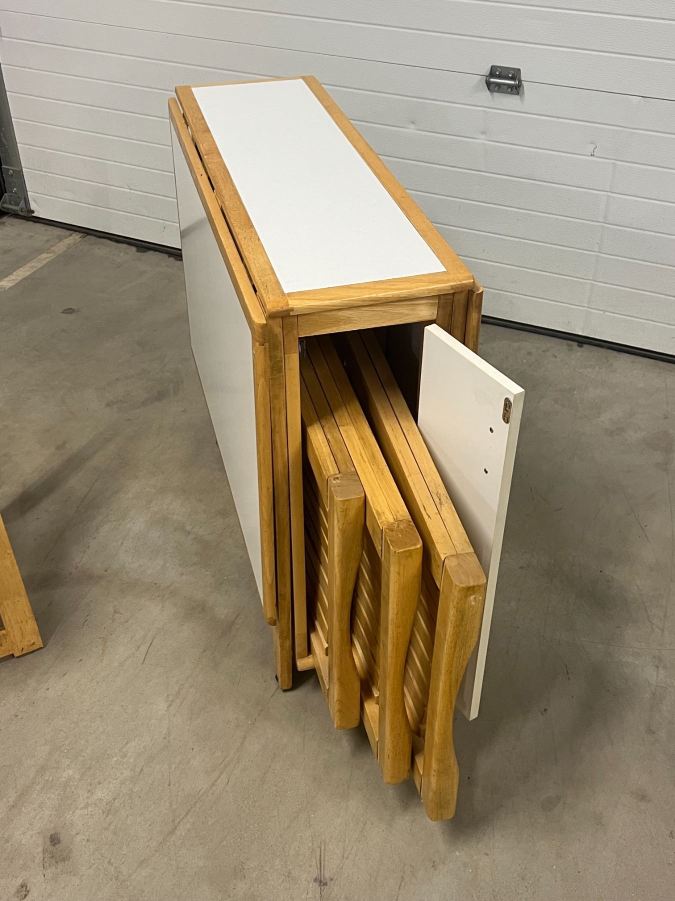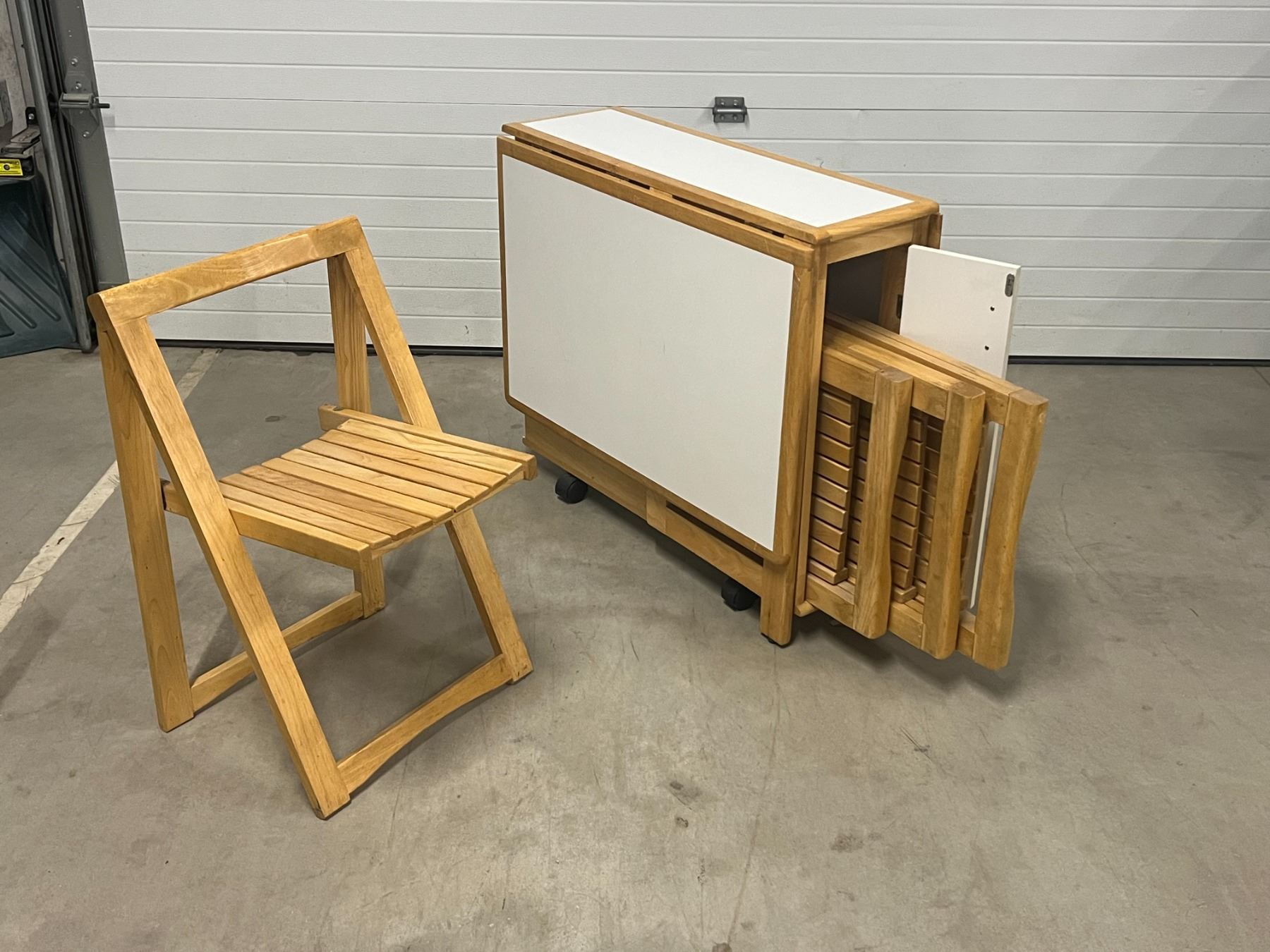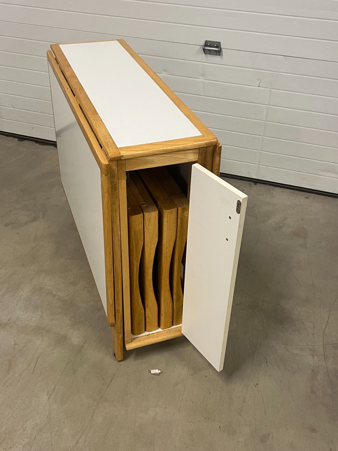 Extra Holiday Seating? Super Functional set in good overall condition. Approx: 34x11.5" & 29"T (two 21.5" Fold up leaves) Spacesaver Dining Set - Drop Leaf Table and 4 Chairs