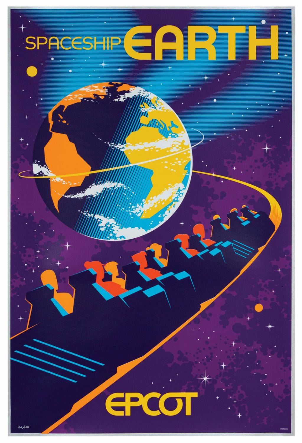 (Epcot, 2020) A serigraph attraction poster print by artist Eric Tan for Epcot's Spaceship Earth. Created in an edition of 100 as part of the Epcot: The Transformation collection, the serigraph is printed using the same process as the original park attraction posters on Stardream metallic silver archival paper and hand numbered at lower left, "46/100". The piece measures 27"x18" and is in very fine condition with minimal wear.
