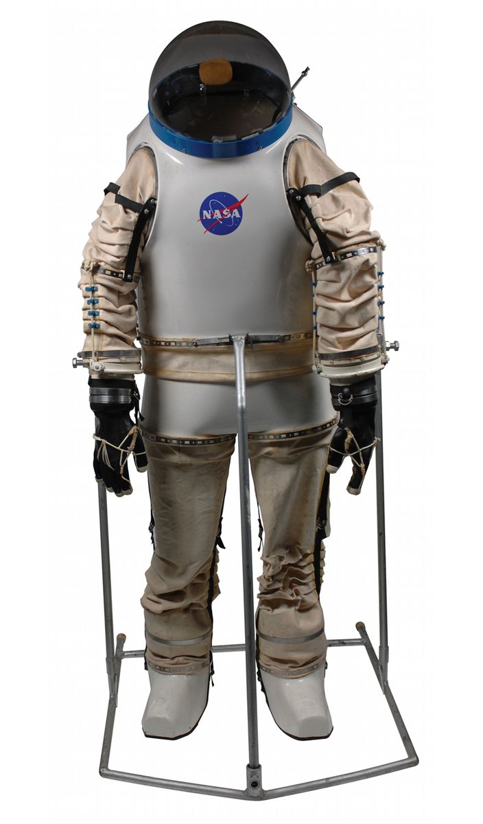 Interesting and uncommon full-size space suit application studies model built by noted pioneer spacesuit designer, author, and historian Gary L. Harris. Model measures approximately 68? high and is held up by a three-legged metal frame which attaches around the mid-section. Model consists of a solid construction one-piece fiberglass torso which extends slightly outward from the back, with a six-screw opening. Torso ends in a clear plastic helmet at the top. Inside has basic electronics with a microphone in the helmet, with wiring that extends through the door on the back through two plugs. Model has canvas arms connected to gloves, and canvas legs which end in solid boots. Arm length is adjustable with a retractable rope system. In fine condition, with expected age wear. Harris was an important figure in space suit and life support design. A magnificent hands-on model.