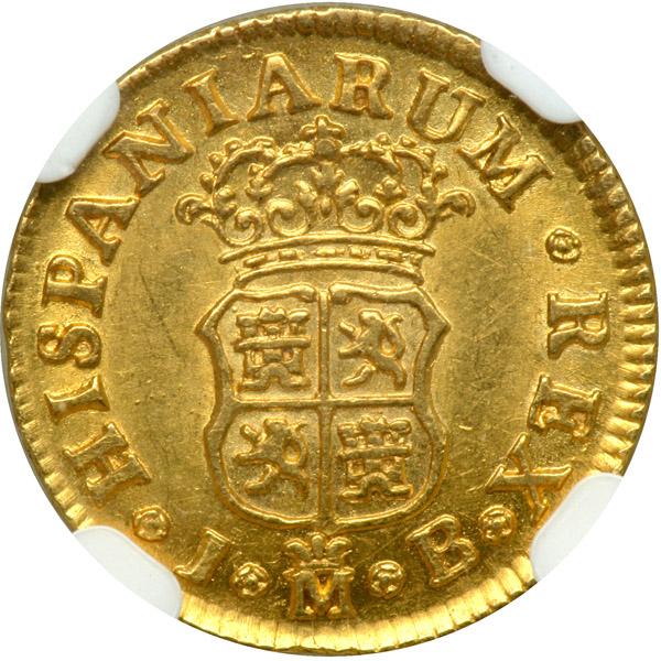 Spain. ½ Escudo, 1747-JB (Madrid). Fr-274; KM-372. Fernando VI. Plain head right. Reverse: Arms. Lustrous. NGC graded MS-62.