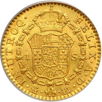 Spain. 1 Escudo, 1781-PJ (Madrid). Fr-288; KM-416.1. Charles III, 1759-1788. Bust right. Reverse: Arms. Evenly struck example with considerable original mint luster. PCGS graded AU-58.