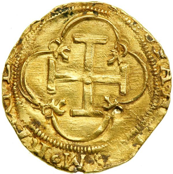 Spain. 1 Escudo, ND (Seville). Fr-178; Cayon-4072. Philip II, 1556-1598. Crowned arms. Reverse: Cross. Surface encrustation, mount removed. NGC graded Very Fine, Details.