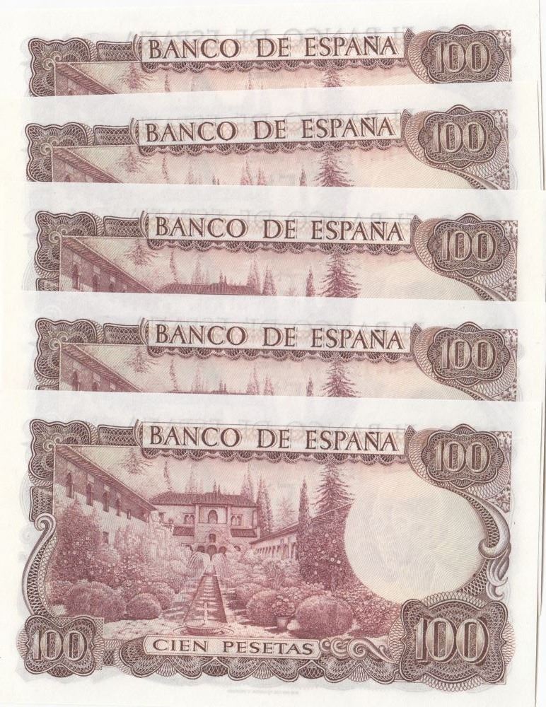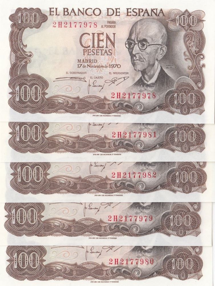 Spain, 100 Pesetas, 1970, UNC, p152, (Total 5 consecutive banknotes)br/serial numbers: 2H 2177978
