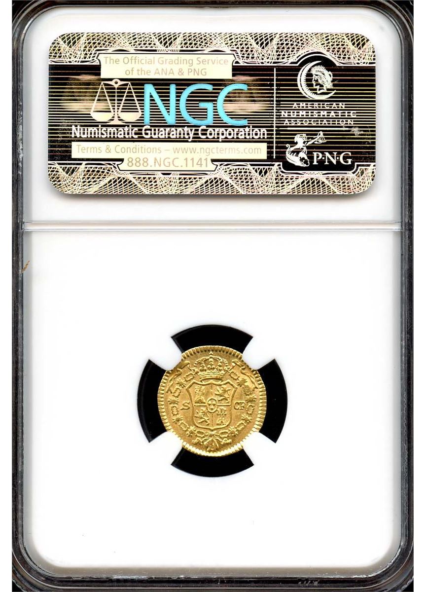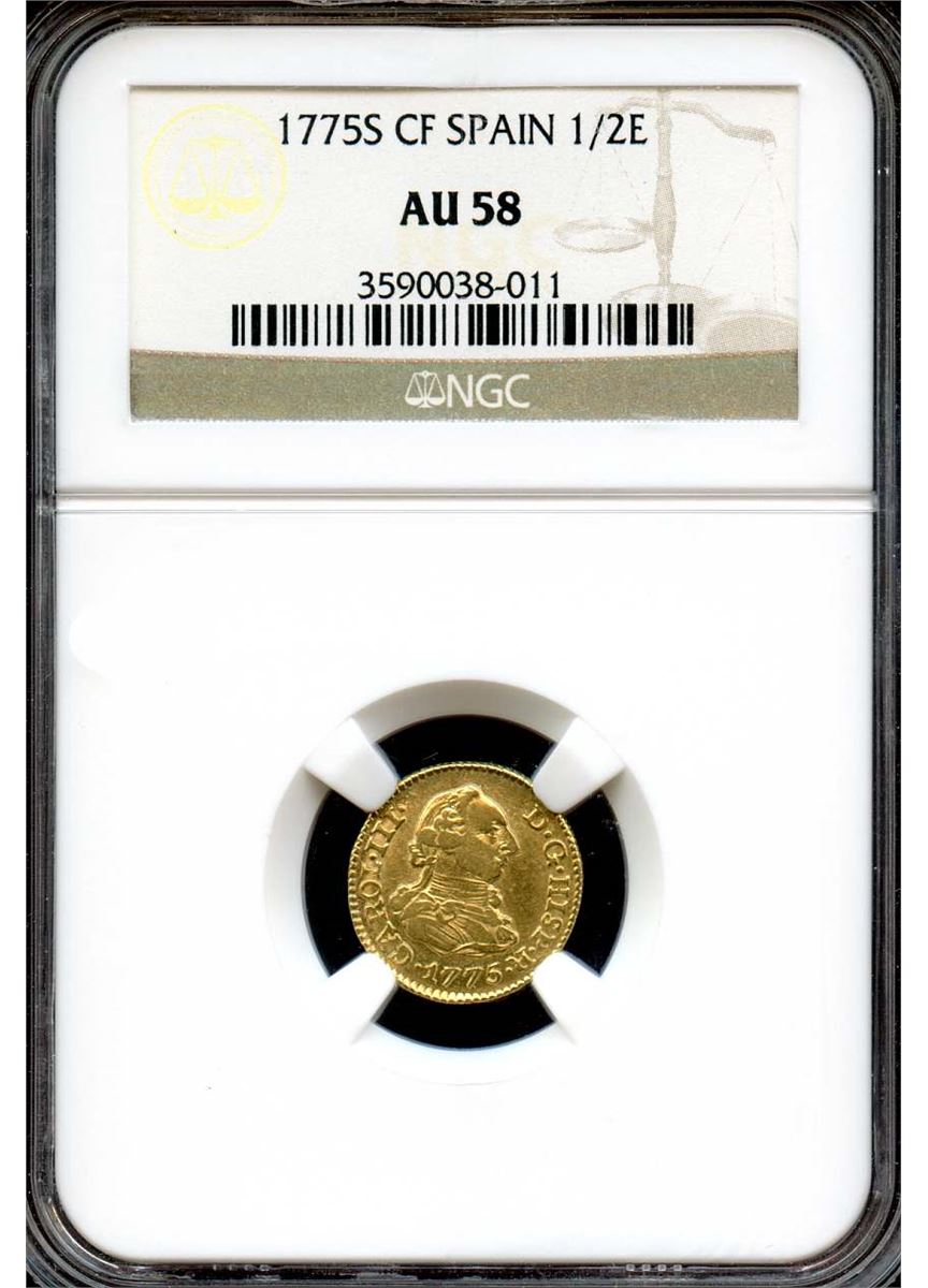 Spain 1775 S, Gold 1/2 Escudo, Seville mint, Bright luster and an uncirculated reverse, NGC certified AU-58
